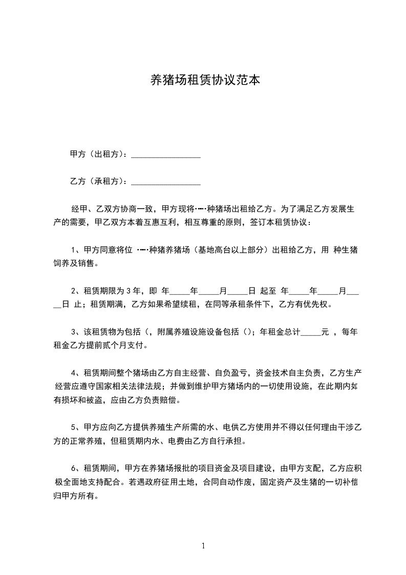 经甲、乙双方协商一致,甲方现将……种猪场出租给乙方。为了满足乙方发展生产的需要,甲乙双方本着互惠互利,相互尊重的原则,签订本租赁协议: