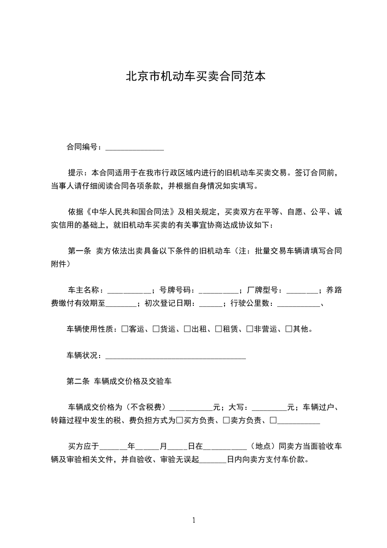提示:本合同适用于在我市行政区域内进行的旧机动车买卖交易。签订合同前,当事人请仔细阅读合同各项条款,并根据自身情况如实填写。