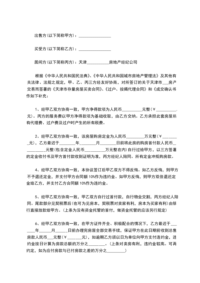 4、本协议是甲、乙双方签订的编号为:的《北京市存量房买卖合同》的补充部分,具有同等法律效力,如本协议与之前双方所签协议有所冲突,以本协议为准,本协议一式三份,甲乙丙三方各执一份,签字生效。