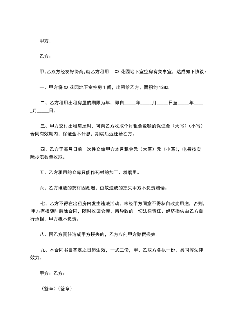 一、甲方将XX花园地下室空房1间,出租给乙方,面积约12M2.