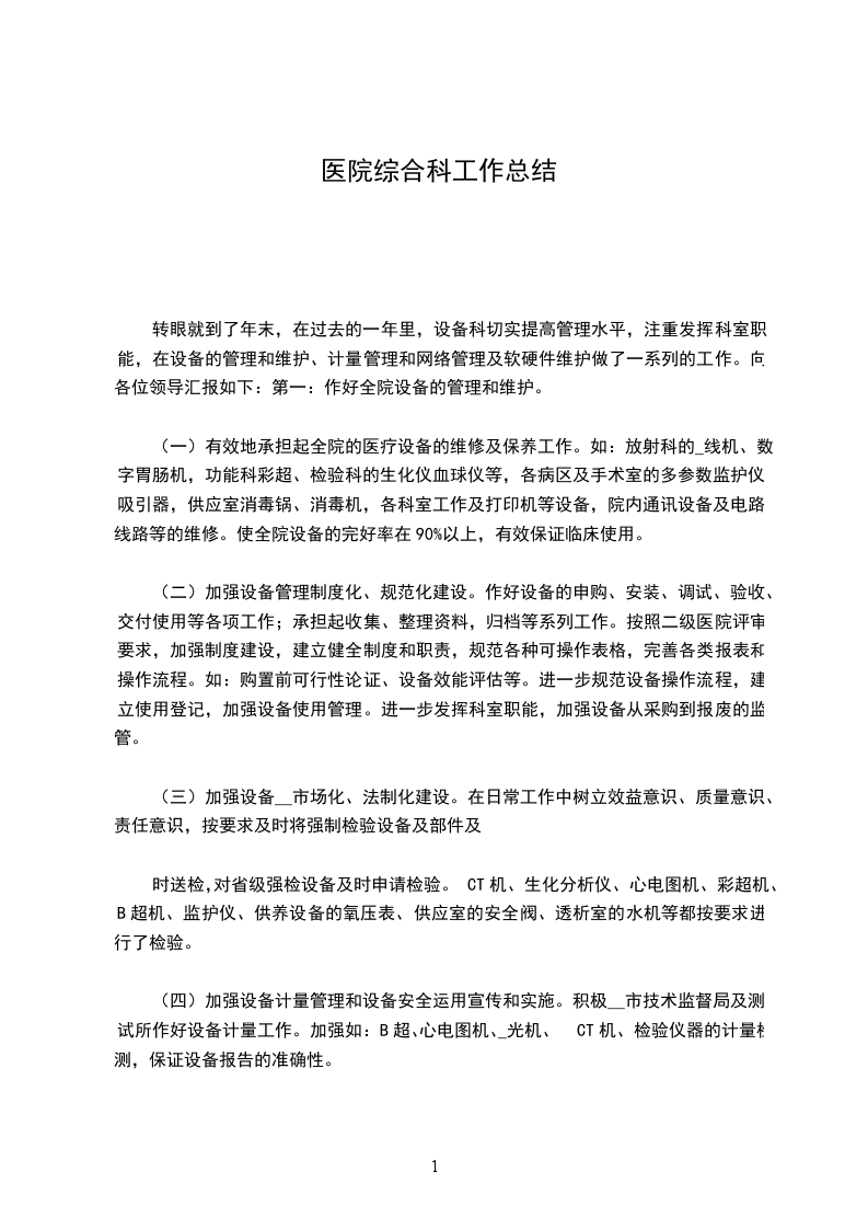 转眼就到了年末,在过去的一年里,设备科切实提高管理水平,注重发挥科室职能,在设备的管理和维护、计量管理和网络管理及软硬件维护做了一系列的工作。向各位领导汇报如下:第一:作好全院设备的管理和维护。