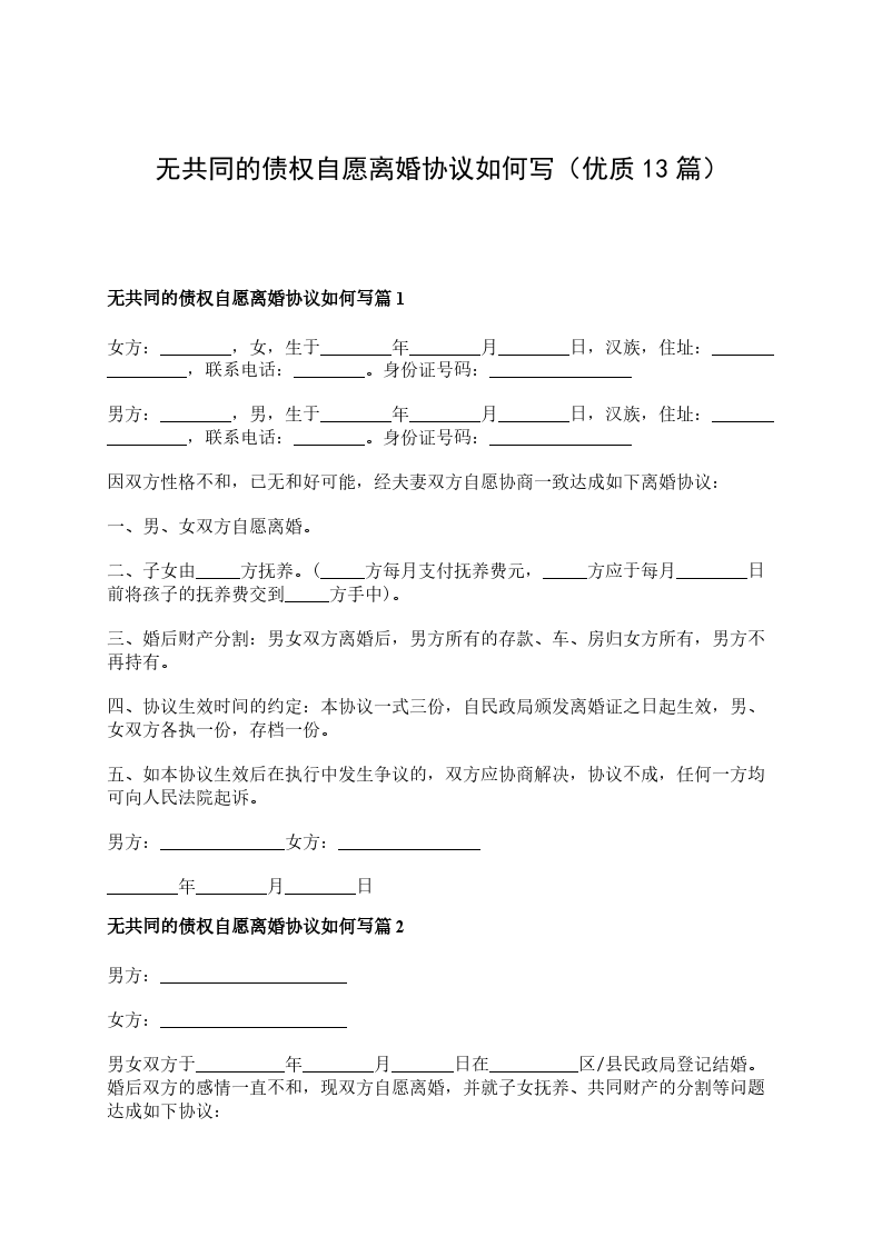 无共同的债权自愿离婚协议如何写篇13
