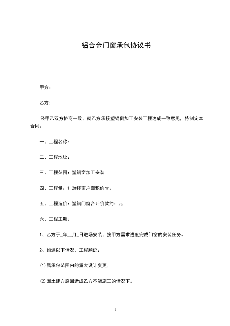 (五)承包方式:按工程单价包工包料,会所及物管用房采用隔热断桥铝木复合50系列门窗;1、2、3、4、5号楼采用隔热断桥50系列平开窗,隔热断桥90系列推拉窗,隔热断桥90系列推拉门,隔热断桥80系列平开门,铝合金百叶、