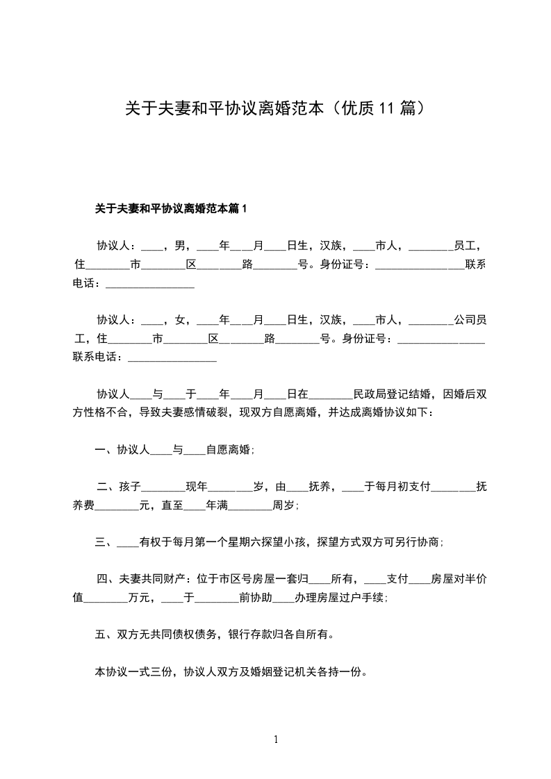 关于夫妻和平协议离婚范本篇11