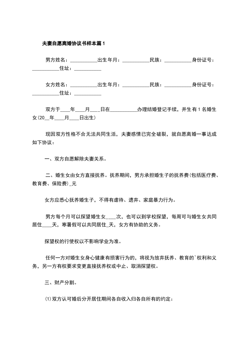 双方于________年________月________日在________________人民政府的民政部门登记结婚,婚后一个子女,因双方性格不和,无法共同生活,自愿离婚,经双方协商一致,订立离婚协议如下: