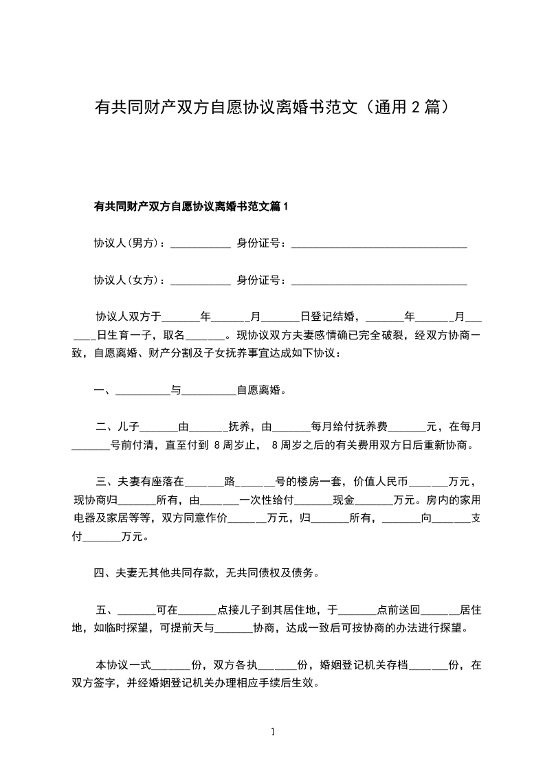 协议人双方于_______年_______月_______日登记结婚,_______年_______月_______日生育一子,取名_______。现协议双方夫妻感情确已完全破裂,经双方协商一致,自愿离婚、财产分割及子女抚养事宜达成如下协议: