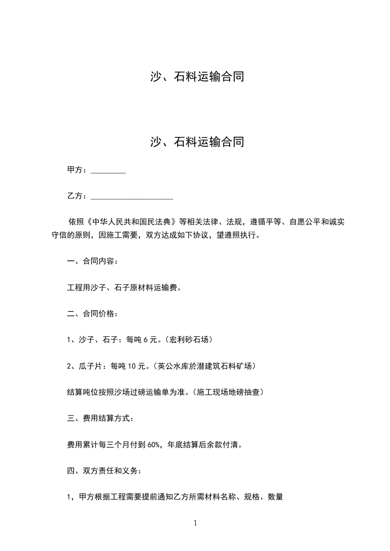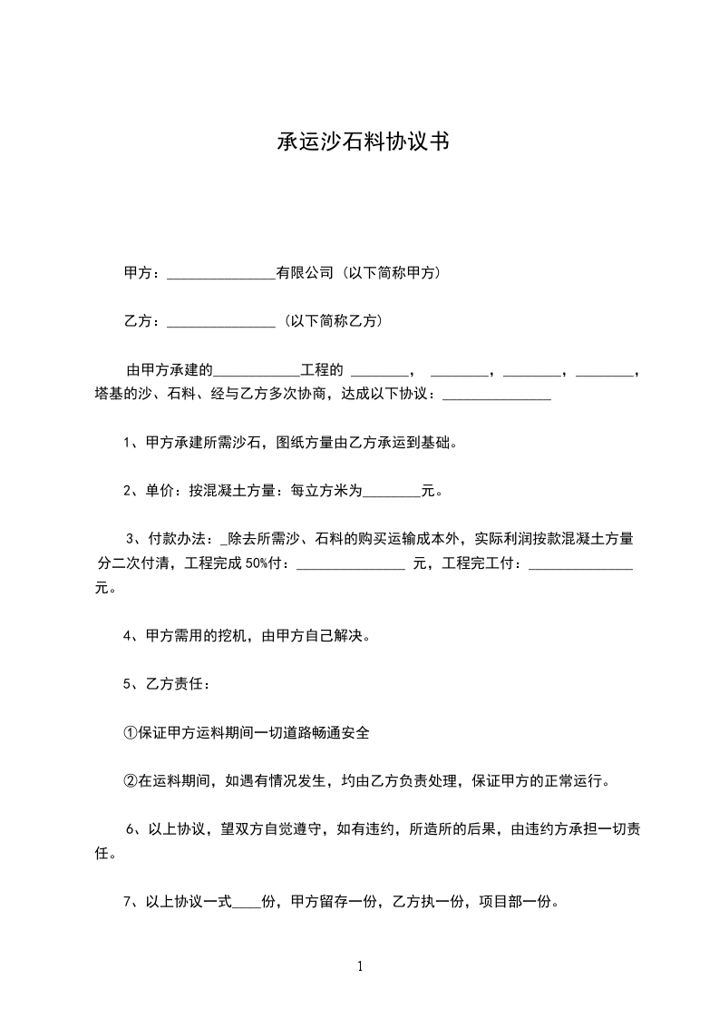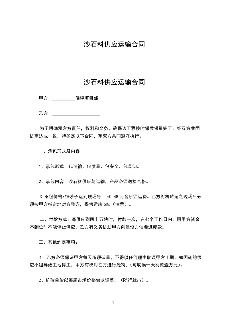 1、甲方承建所需沙石,图纸方量由乙方承运到基础。