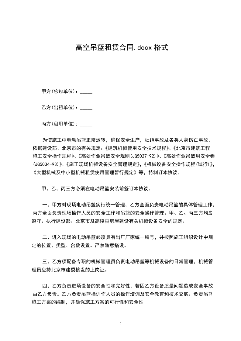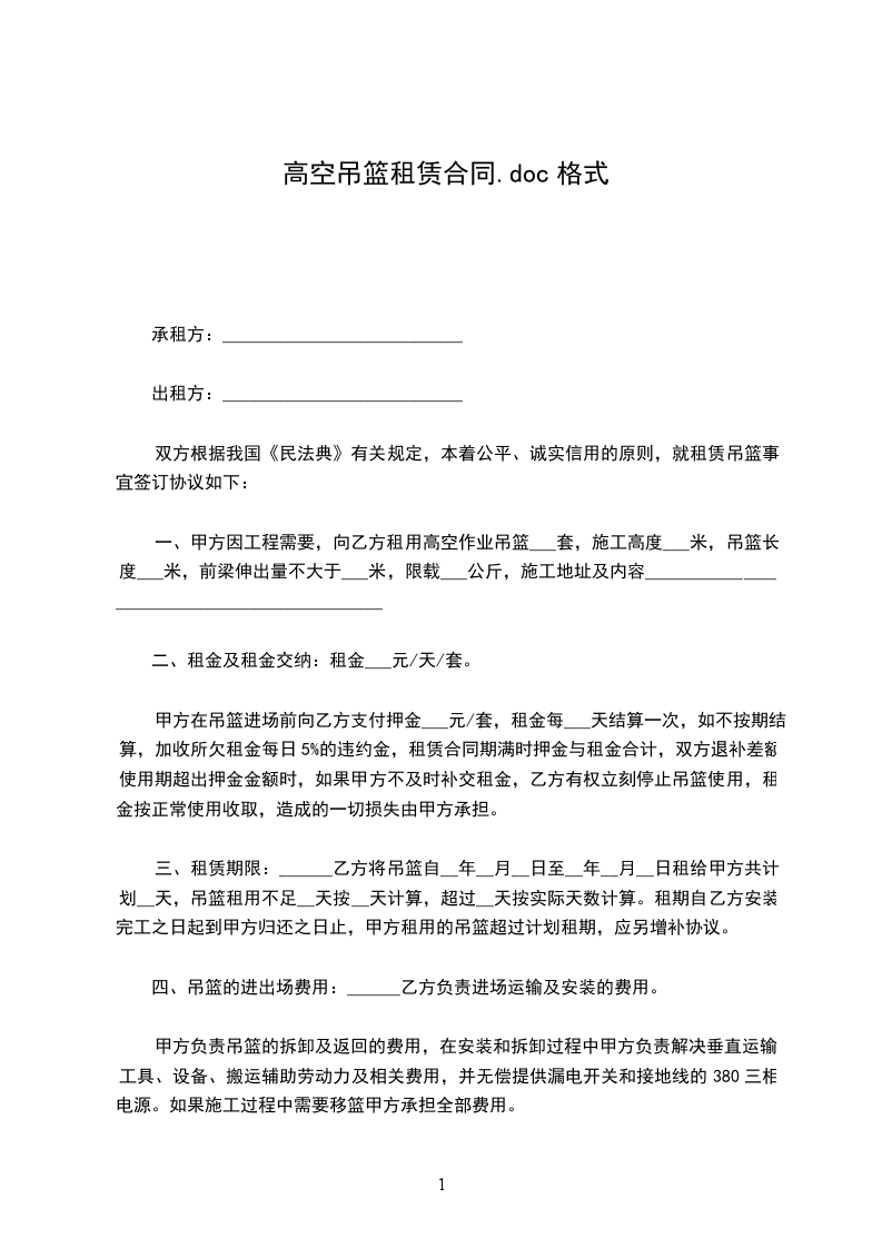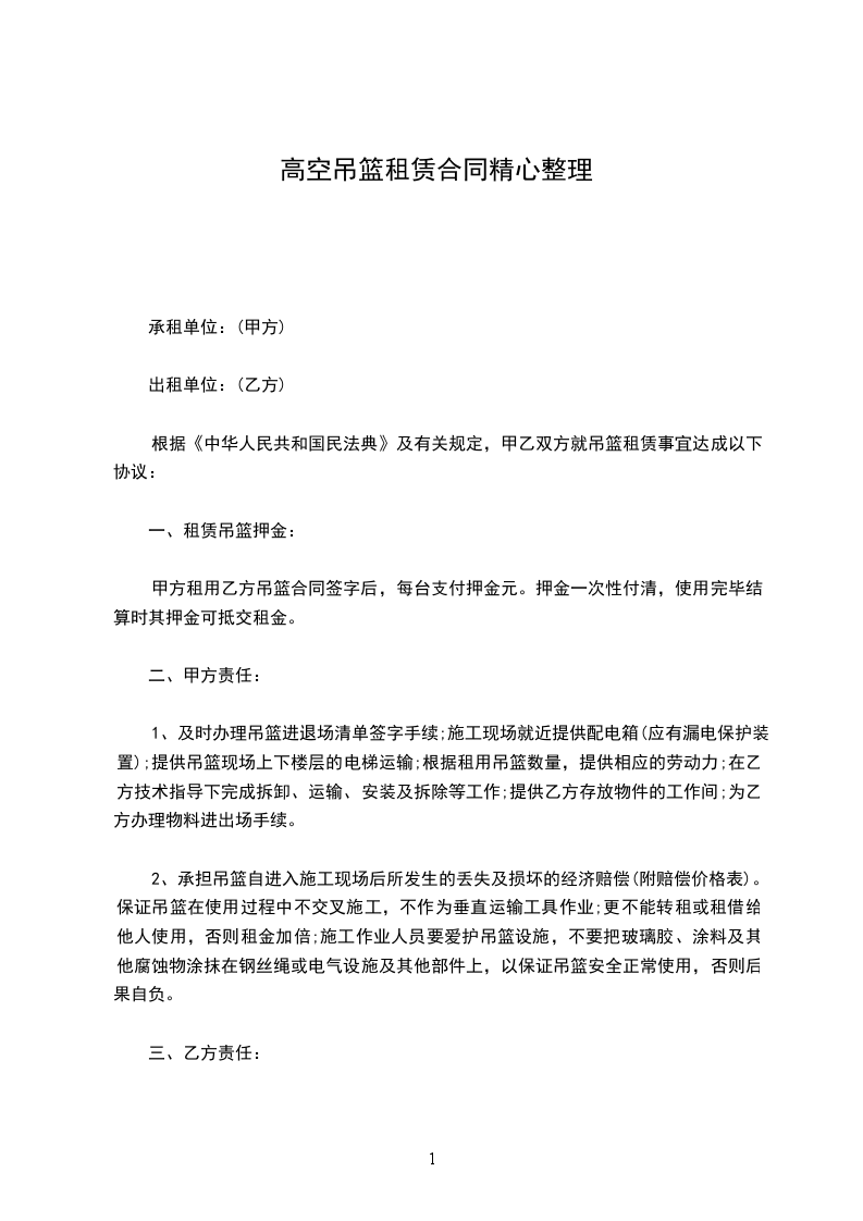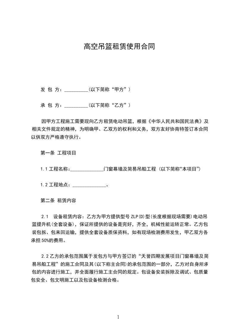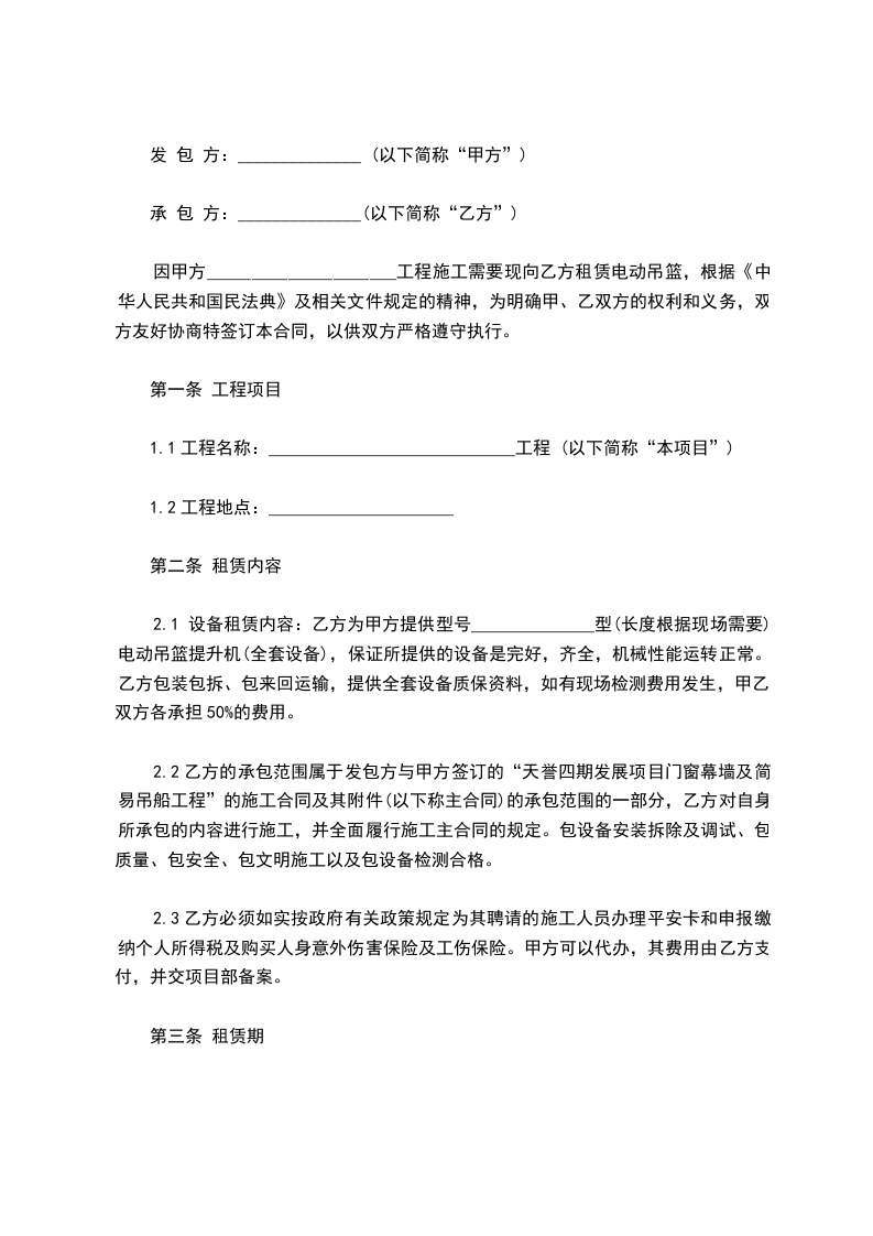 因甲方_____________________工程施工需要现向乙方租赁电动吊篮,根据《中华人民共和国民法典》及相关文件规定的精神,为明确甲、乙双方的权利和义务,双方友好协商特签订本合同,以供双方严格遵守执行。