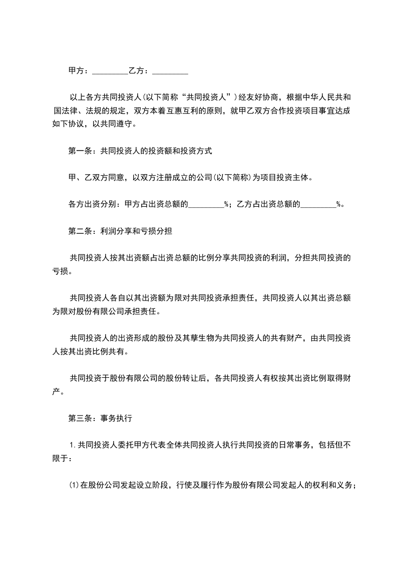 以上各方共同投资人(以下简称“共同投资人”)经友好协商,根据中华人民共和国法律、法规的规定,双方本着互惠互利的原则,就甲乙双方合作投资项目事宜达成如下协议,以共同遵守。