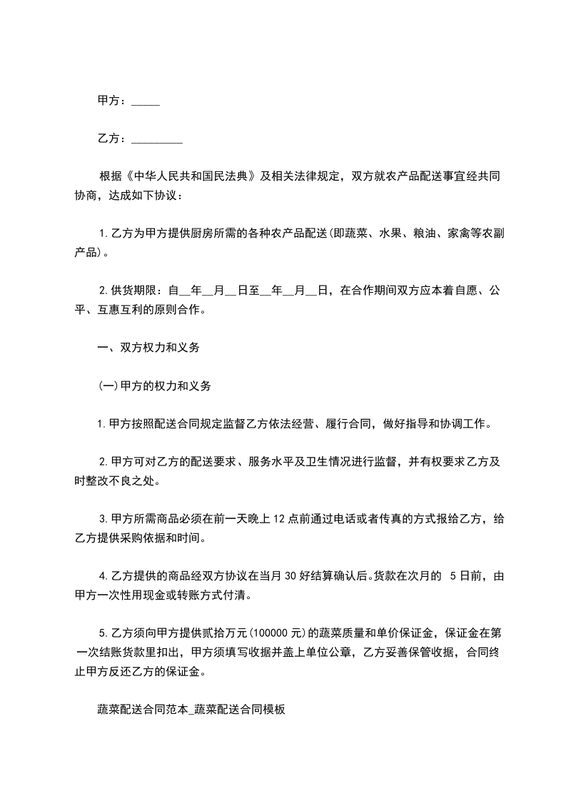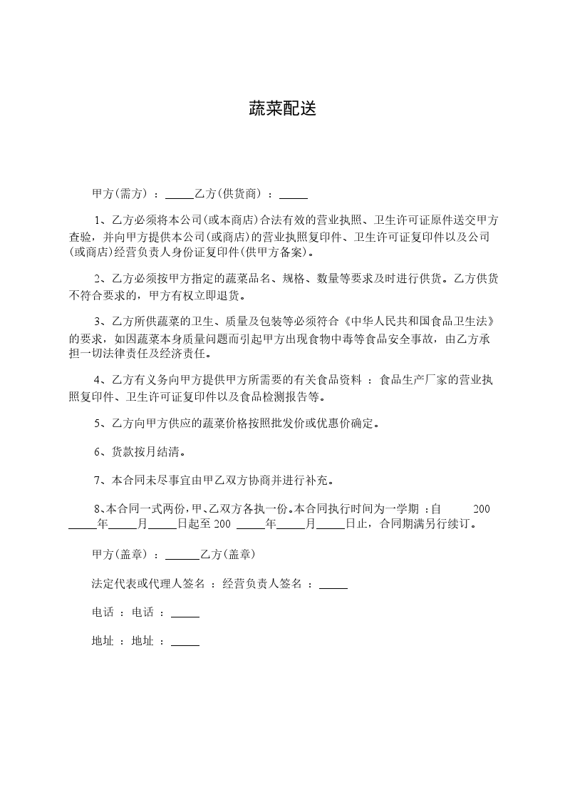 乙方应保证每天上午8:00之前将甲方所订的货物送到甲方食堂;乙方如送货迟到半小时,影响了甲方的正常工作,要罚当天总菜款的10%。特殊情况除外。