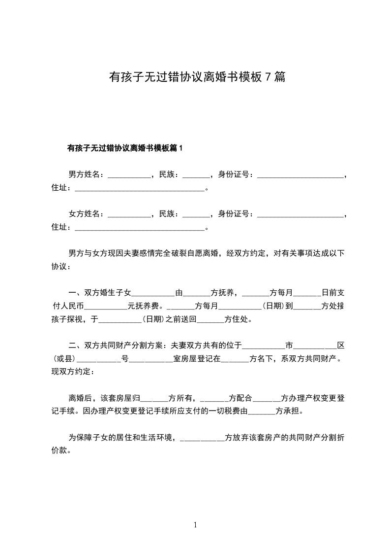 有孩子无过错协议离婚书模板篇7