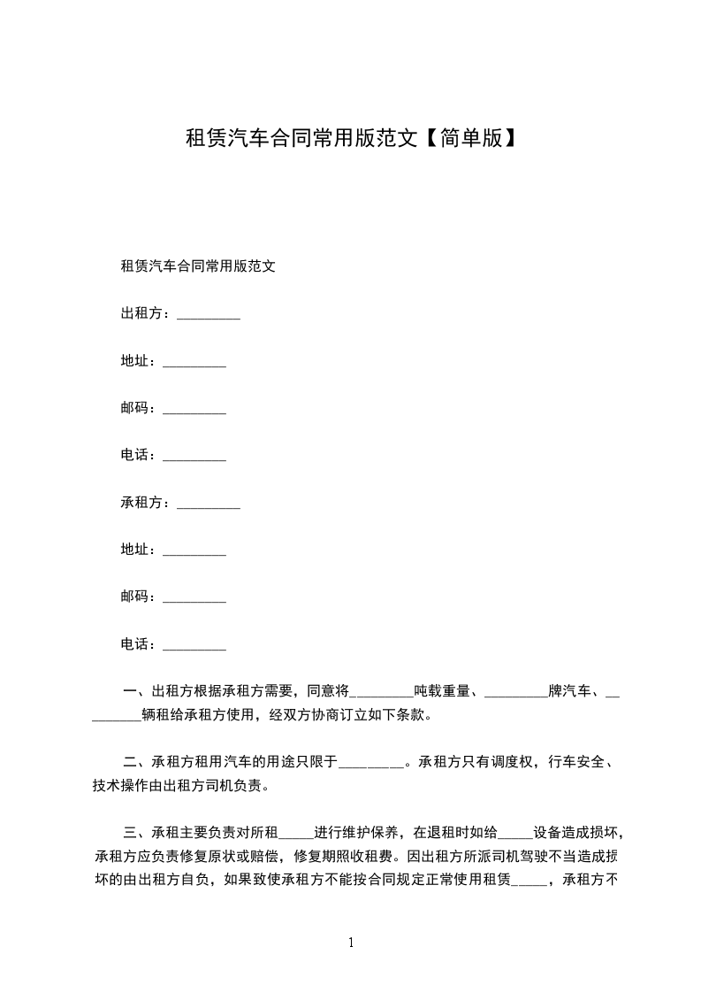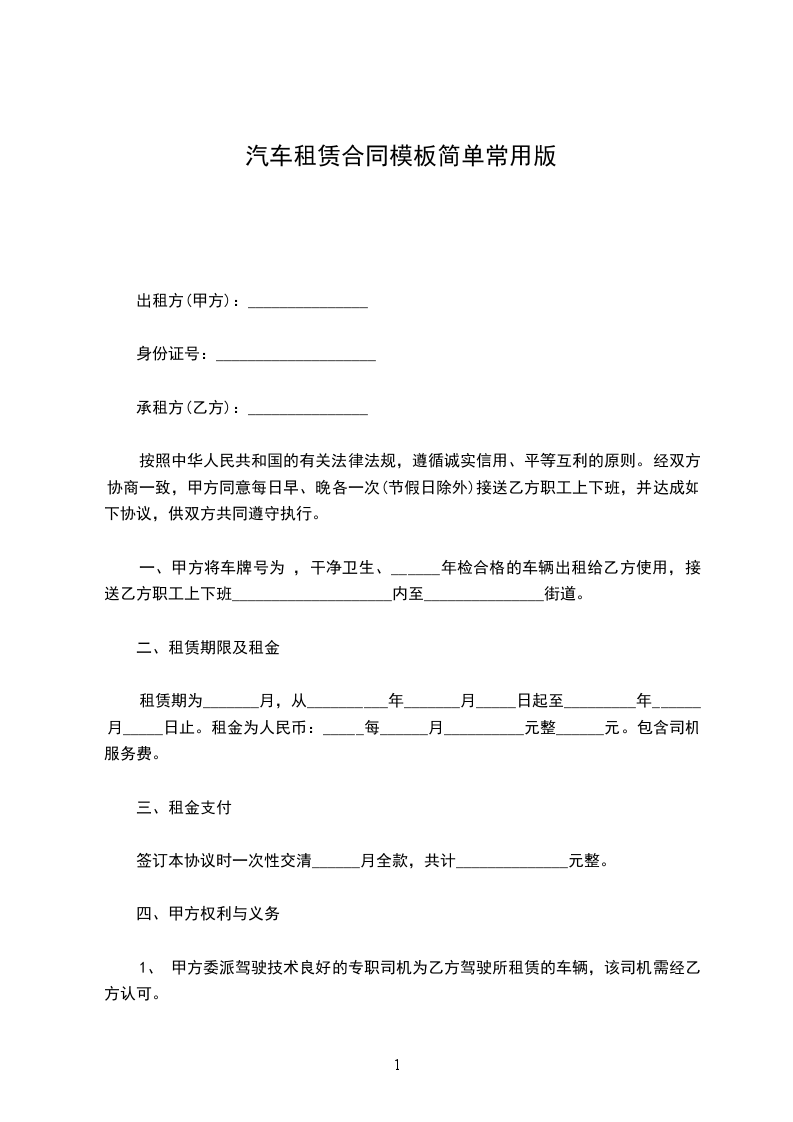 一、甲方将车牌号为 ,干净卫生、______年检合格的车辆出租给乙方使用,接送乙方职工上下班____________________内至_______________街道。