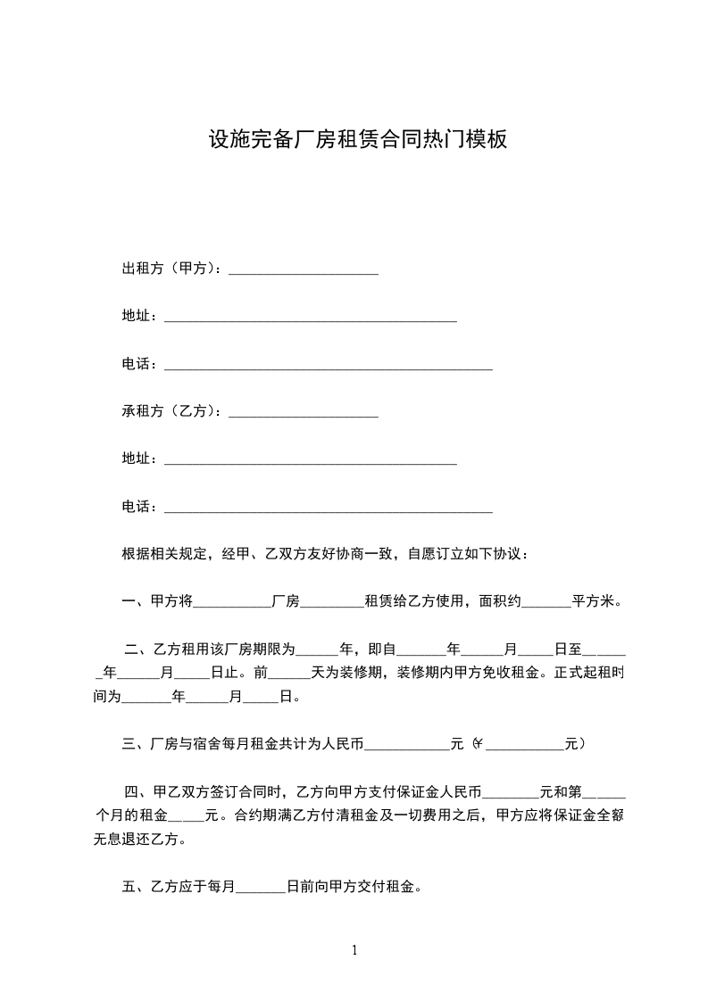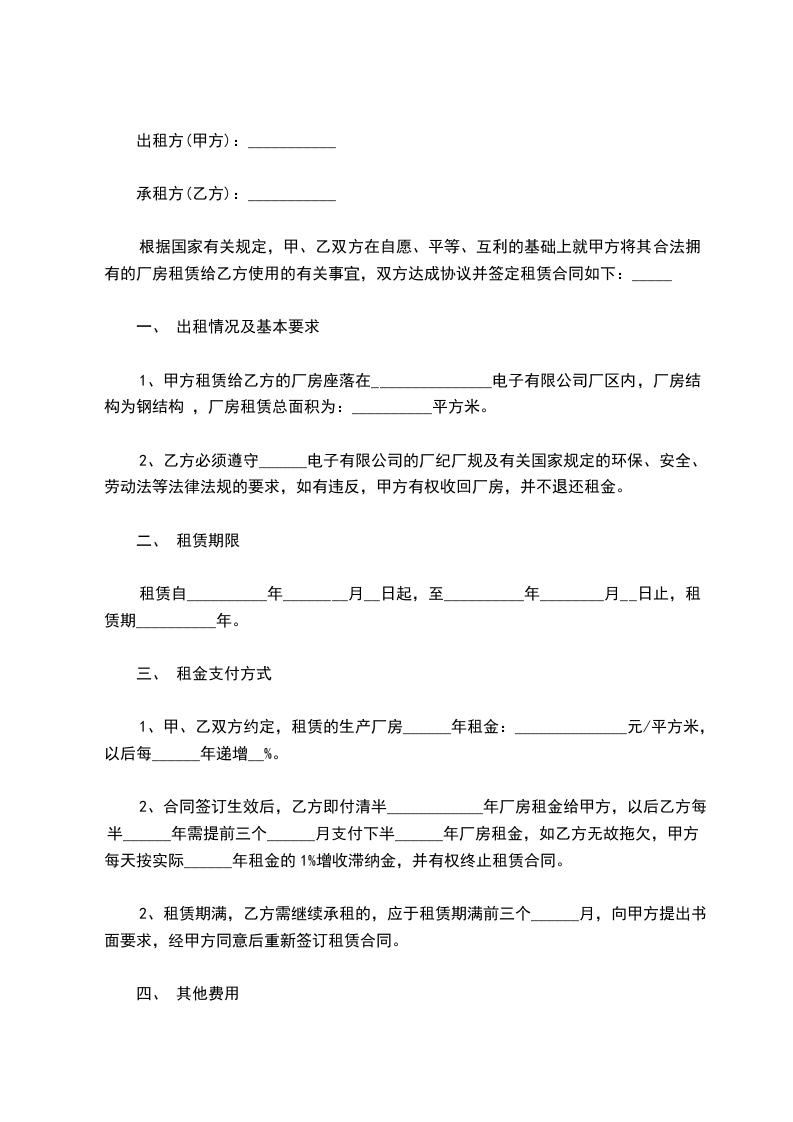 1、甲方租赁给乙方的厂房座落在_______________电子有限公司厂区内,厂房结构为钢结构 ,厂房租赁总面积为:__________平方米。