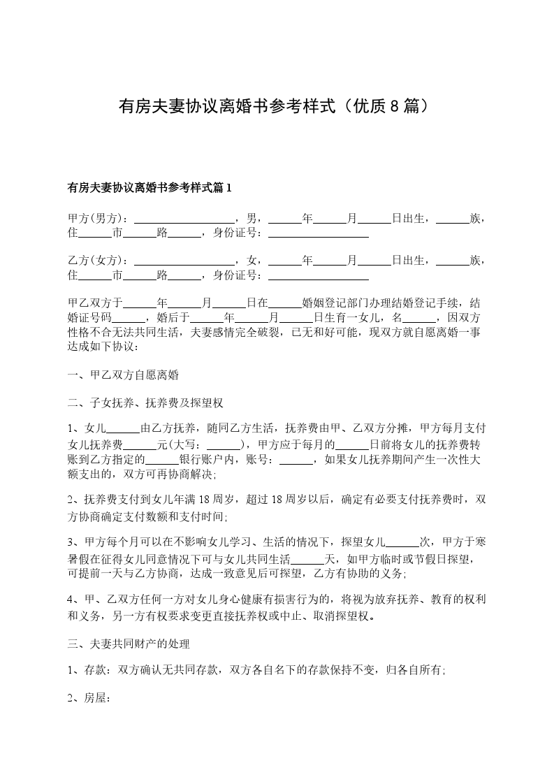 有房夫妻协议离婚书参考样式篇8