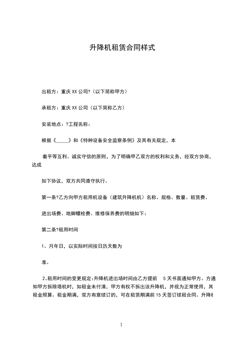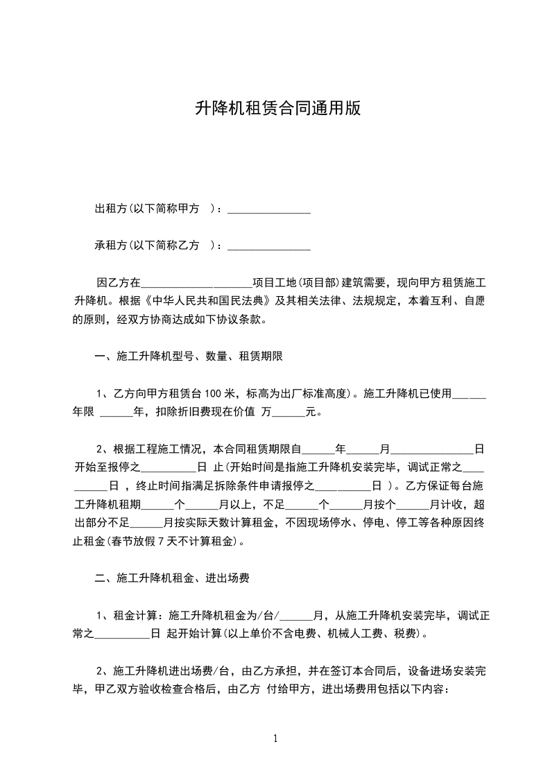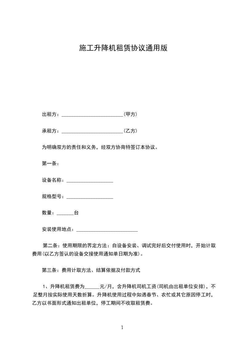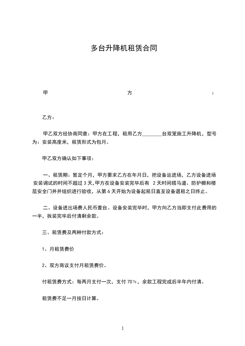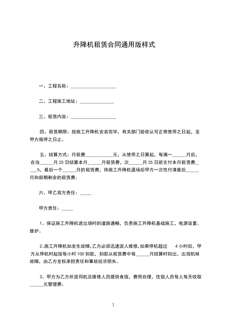 五、结算方式:月租费____________元,从使用之日算起,每满一______月后,在当______月25日结算本月______月租赁费,次______月25日前支付本月租赁费_____%,最后一个______月的租赁费,待施工升降机退场后甲方一次性付清最后______月和前期剩余的租赁费。
