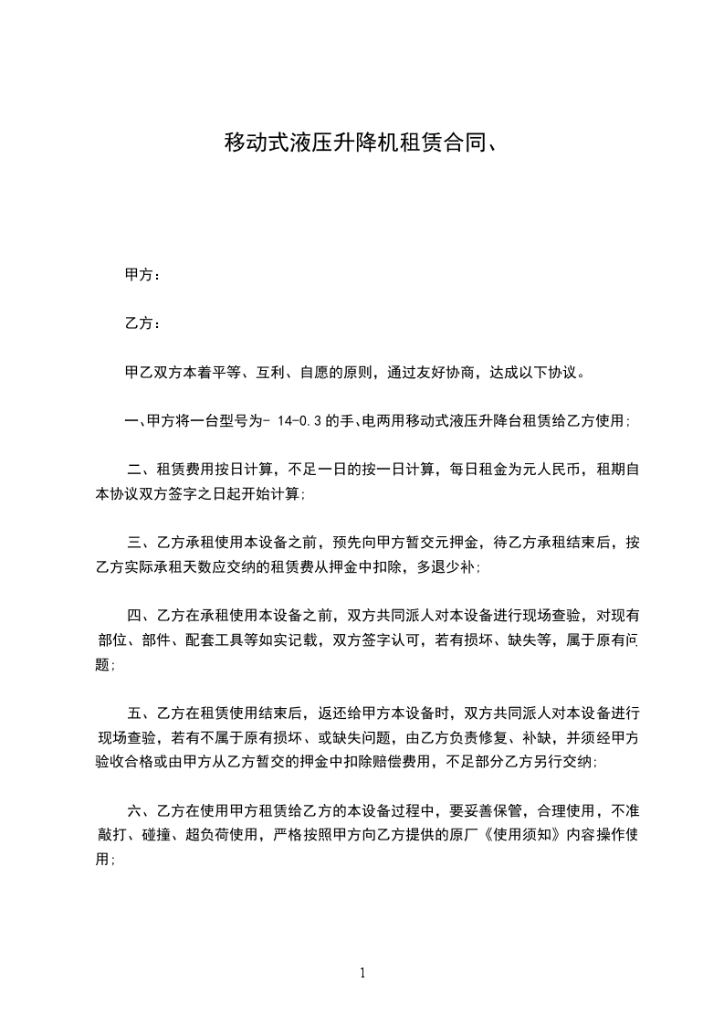 4、机械发生故障,无论白天、黑夜必须组织人力抢修,保证甲方对升降机的正常使用。如排除故障不及时,造成损失由乙方承担。机械修理时间超过4小时按一个台班扣除租费,不足4小时按半个台班扣除租费。