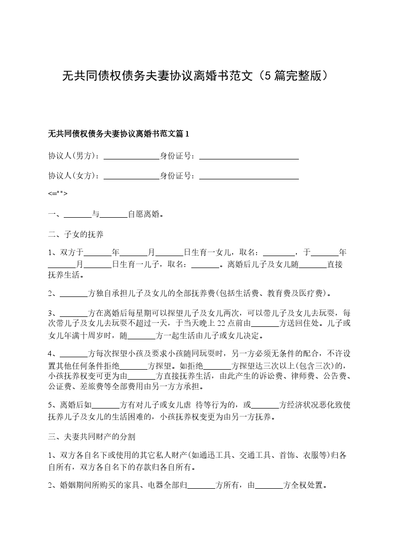 无共同债权债务夫妻协议离婚书范文篇1