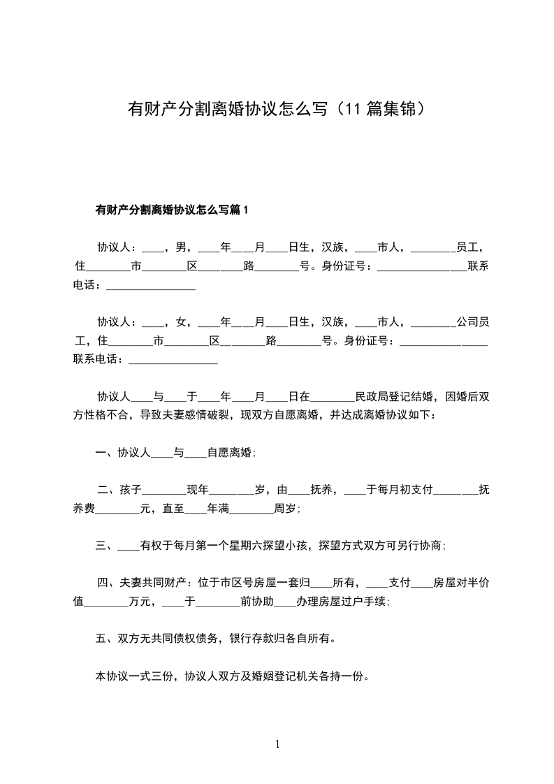 (1)存款:双方名下现有银行存款共______元,双方各分一半,为______元。分配方式:各自名下的存款保持不变,但男方(女方)应于____年__月__日前一次性支付____元给女方(男方)。