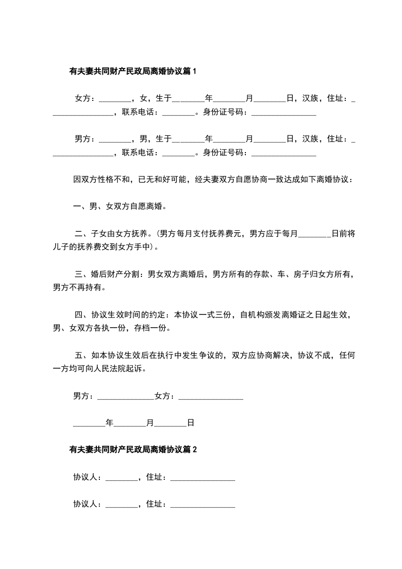 协议人双方于_______年_______月_______日在_______(结婚登记机关)办理结婚登记手续。因双方性格不合无法共同生活,夫妻感情已完全破裂,双方同意离婚并达成如下协议: