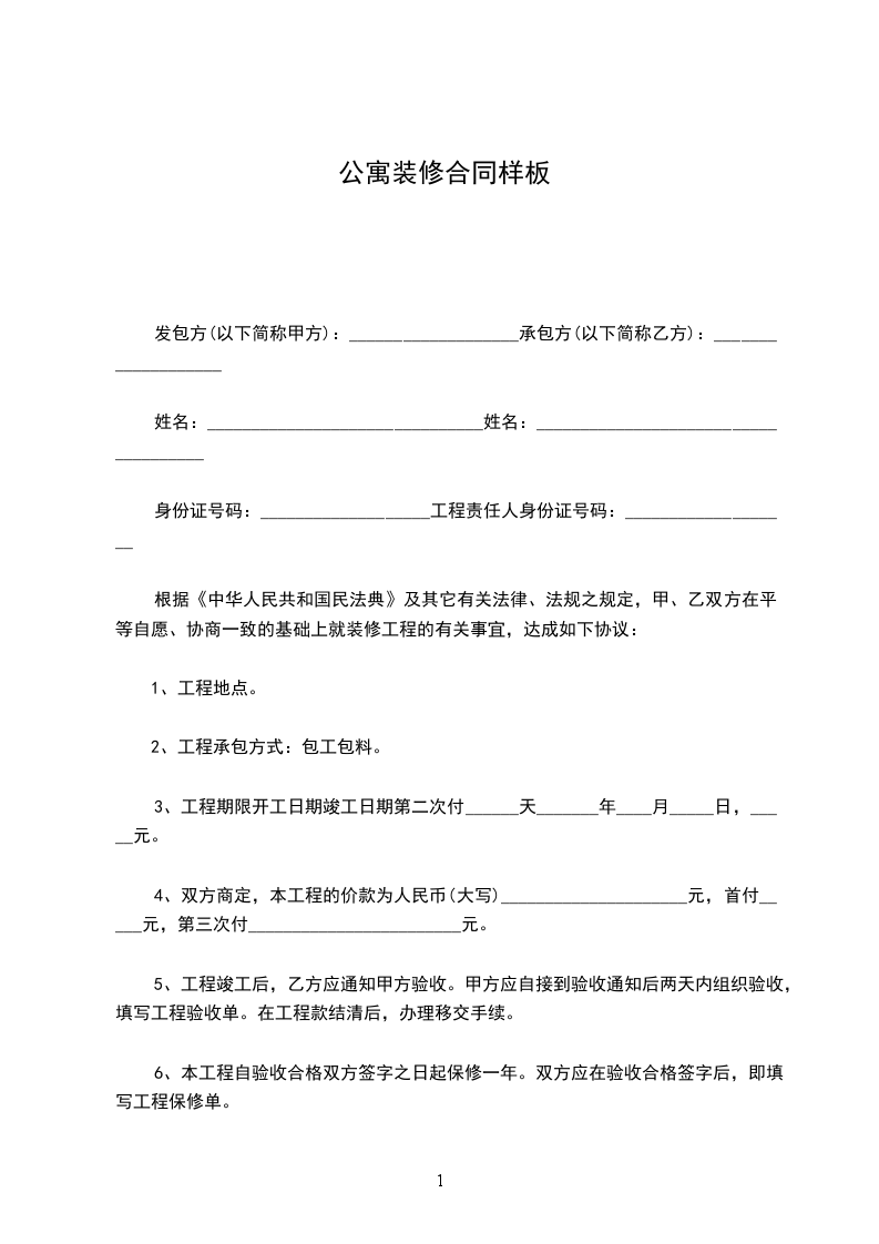 六、工程造价:材料由甲方提供,甲方支付乙方装修人工费_________元人民币。