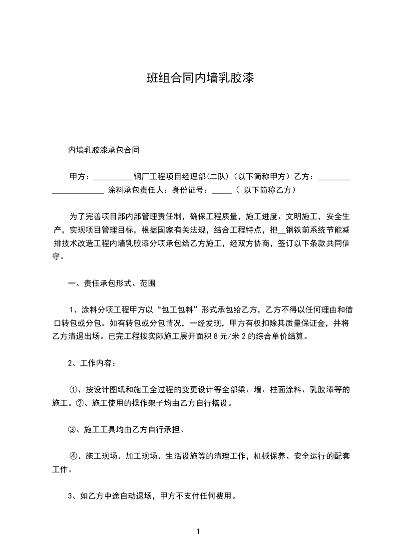 为了完善项目部内部管理责任制,确保工程质量,施工进度、文明施工,安全生产,实现项目管理目标,根据国家有关法规,结合工程特点,把__钢铁前系统节能减排技术改造工程内墙乳胶漆分项承包给乙方施工,经双方协商,签订以下条款共同信守。