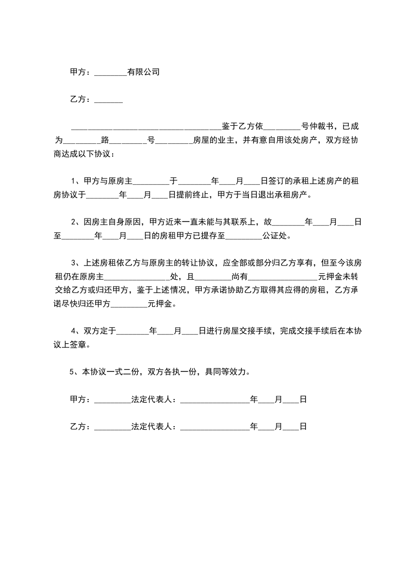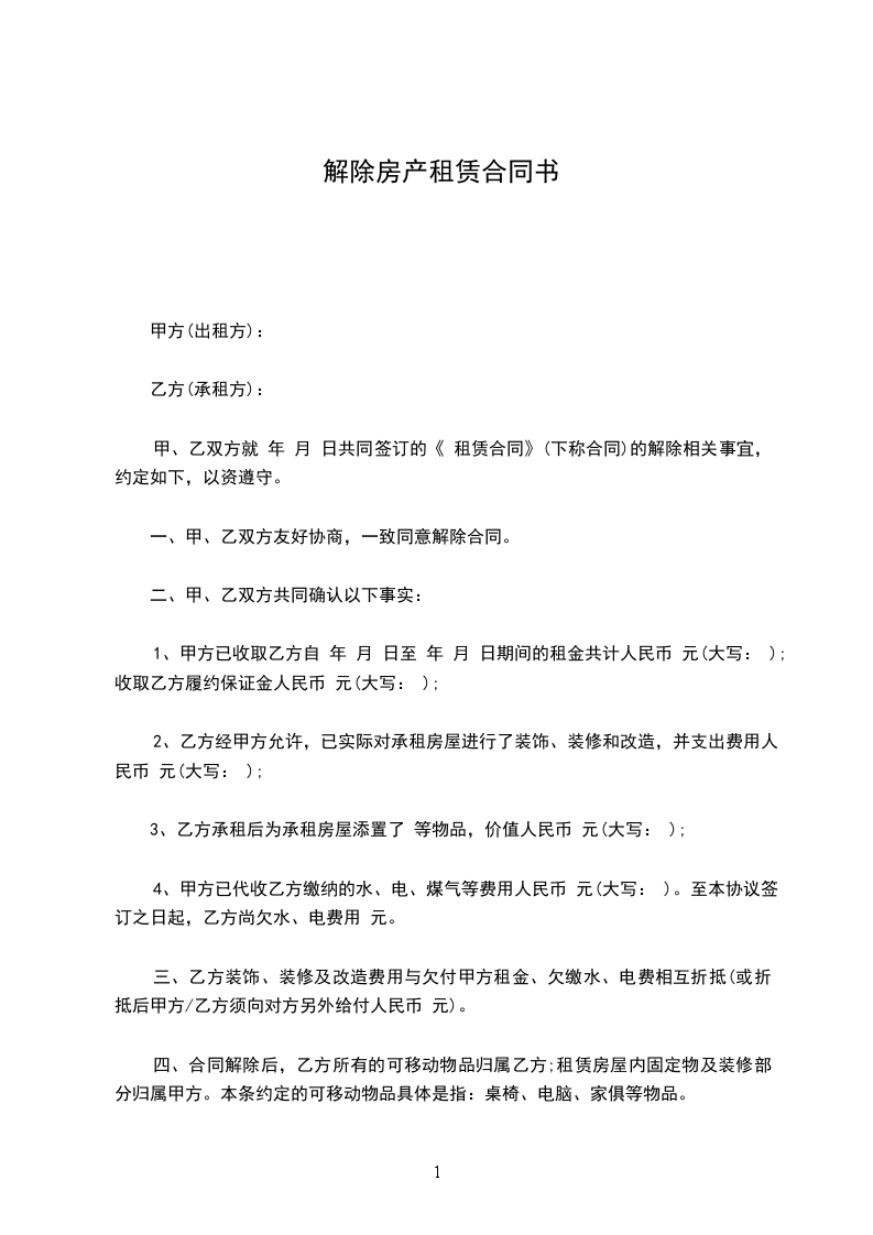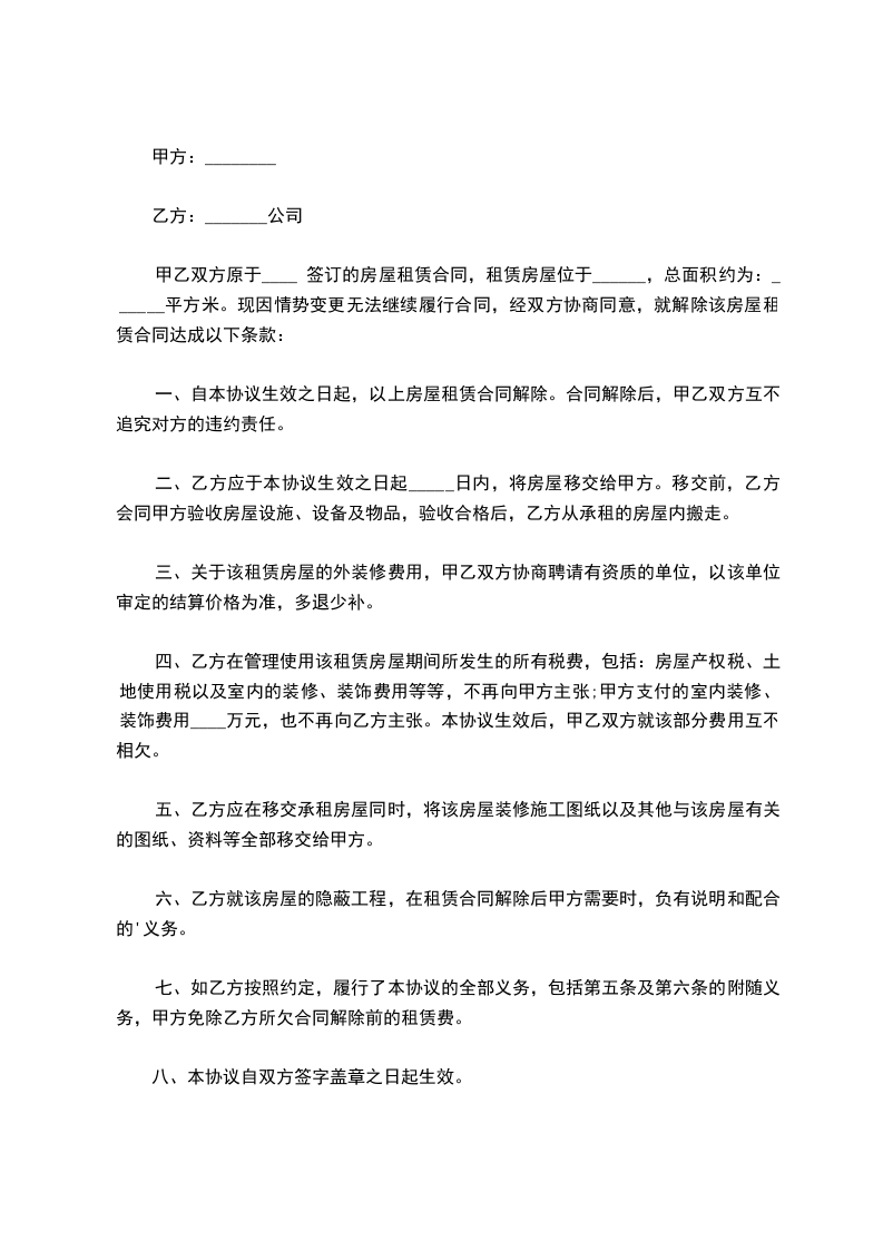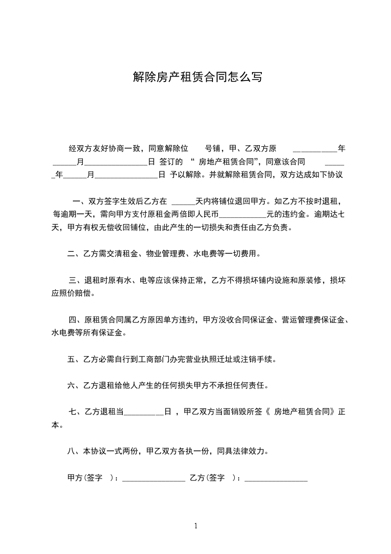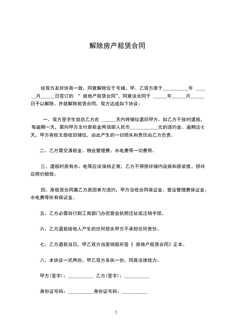 经双方友好协商一致,同意解除位于号铺,甲、乙双方原于___________年 ______月______日签订的 “ 房地产租赁合同”,同意该合同于 ______年______月______日予以解除。并就解除租赁合同,双方达成如下协议: