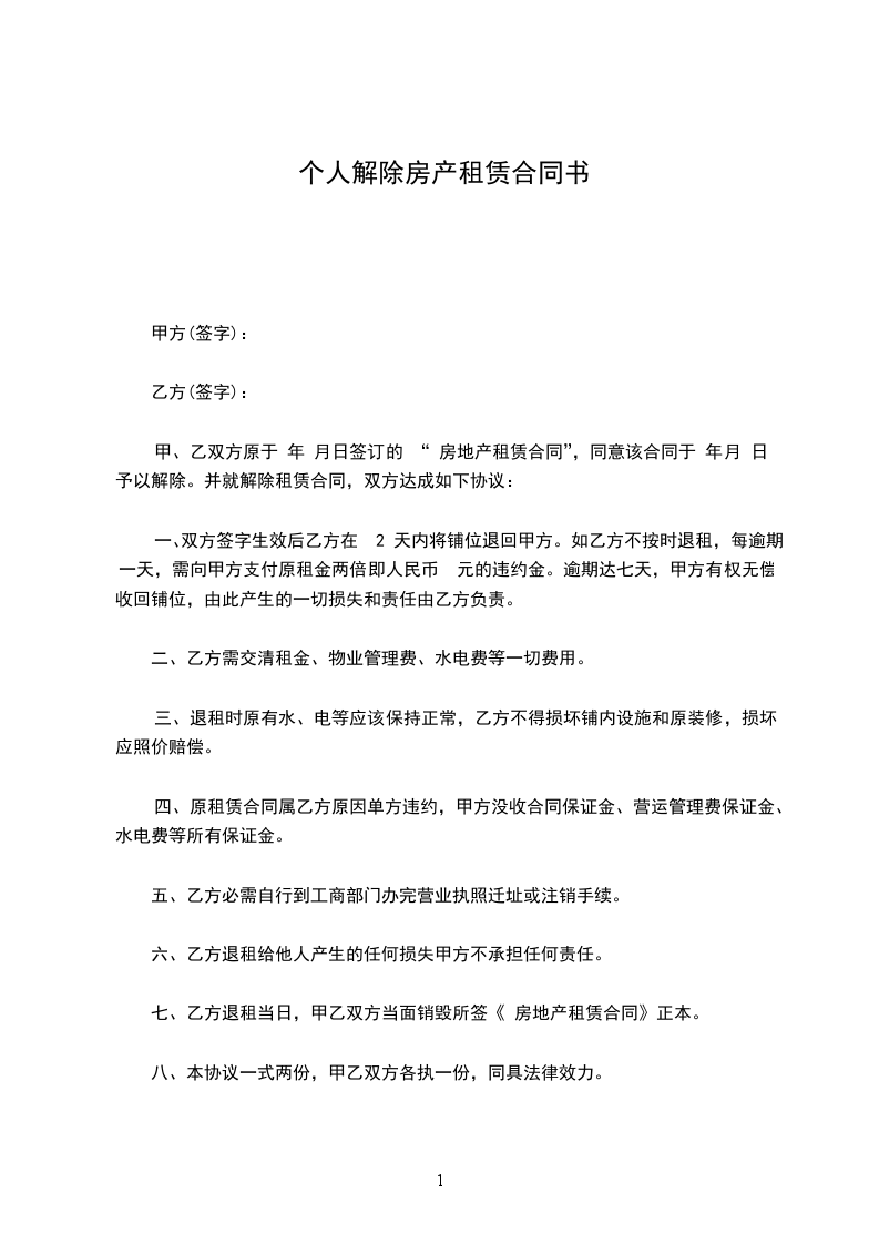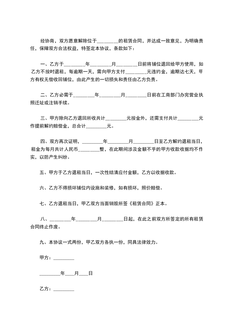 一、双方签字生效后乙方在 ______天内将铺位退回甲方。如乙方不按时退租,每逾期一天,需向甲方支付原租金两倍即人民币____________元的违约金。逾期达七天,甲方有权无偿收回铺位,由此产生的一切损失和责任由乙方负责。