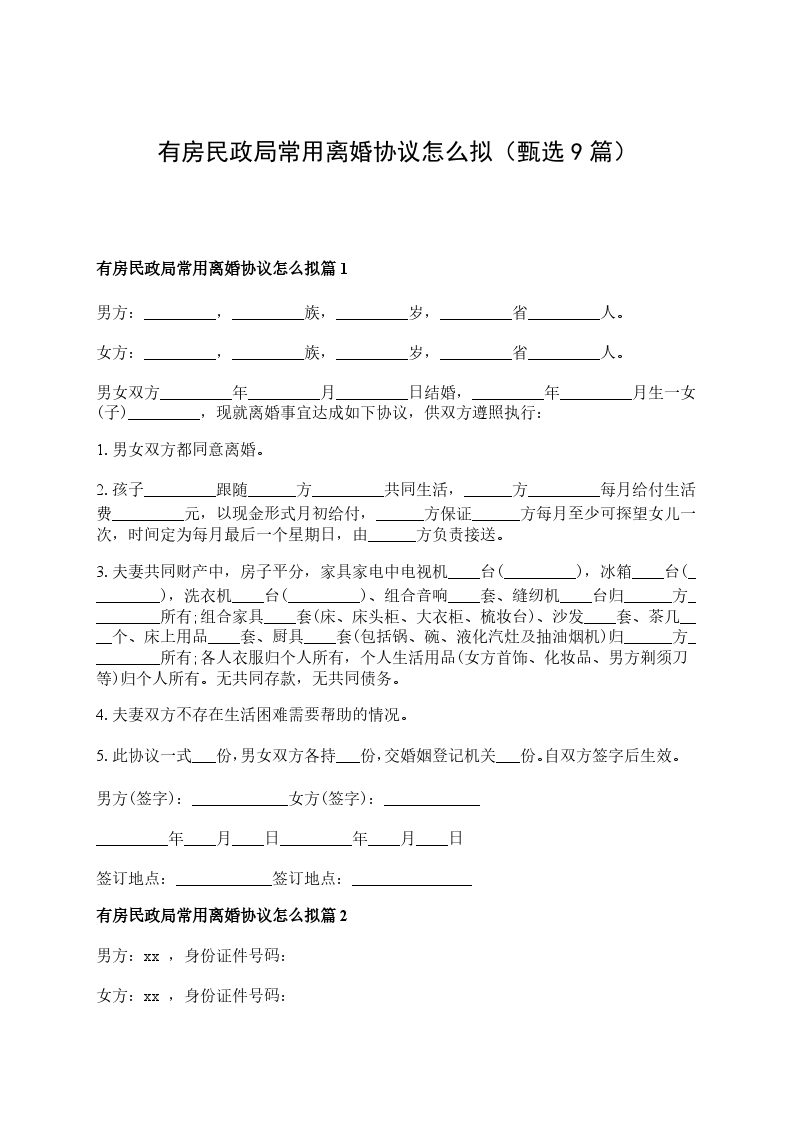 2、【房产】双方有夫妻共同财产座落在××路××小区××室商品房一套,价值人民币×××××万元,现协商归男方/女方所有,由男方/女方一次性给付男方/女方现金×××××万元,此款在本协议签订后的××天内付清;此房内的家用电器及家俱归男方/女方所有。