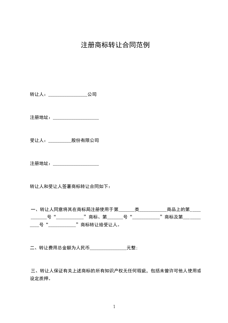 一、转让人同意将其在商标局注册使用于第_______类____________商品上的第____________号“____________”商标、第_______号“____________”商标及第____________号“____________”商标转让给受让人。