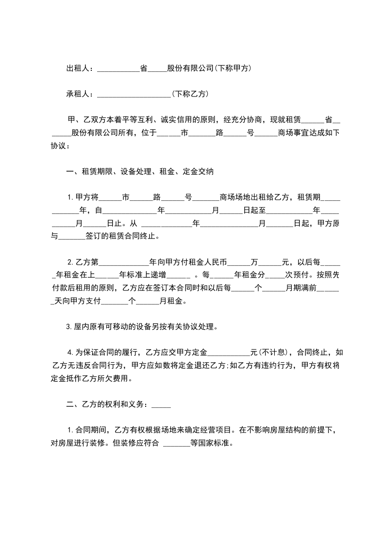 甲、乙双方本着平等互利、诚实信用的原则,经充分协商,现就租赁______省_______股份有限公司所有,位于______市_______路______号______商场事宜达成如下协议: