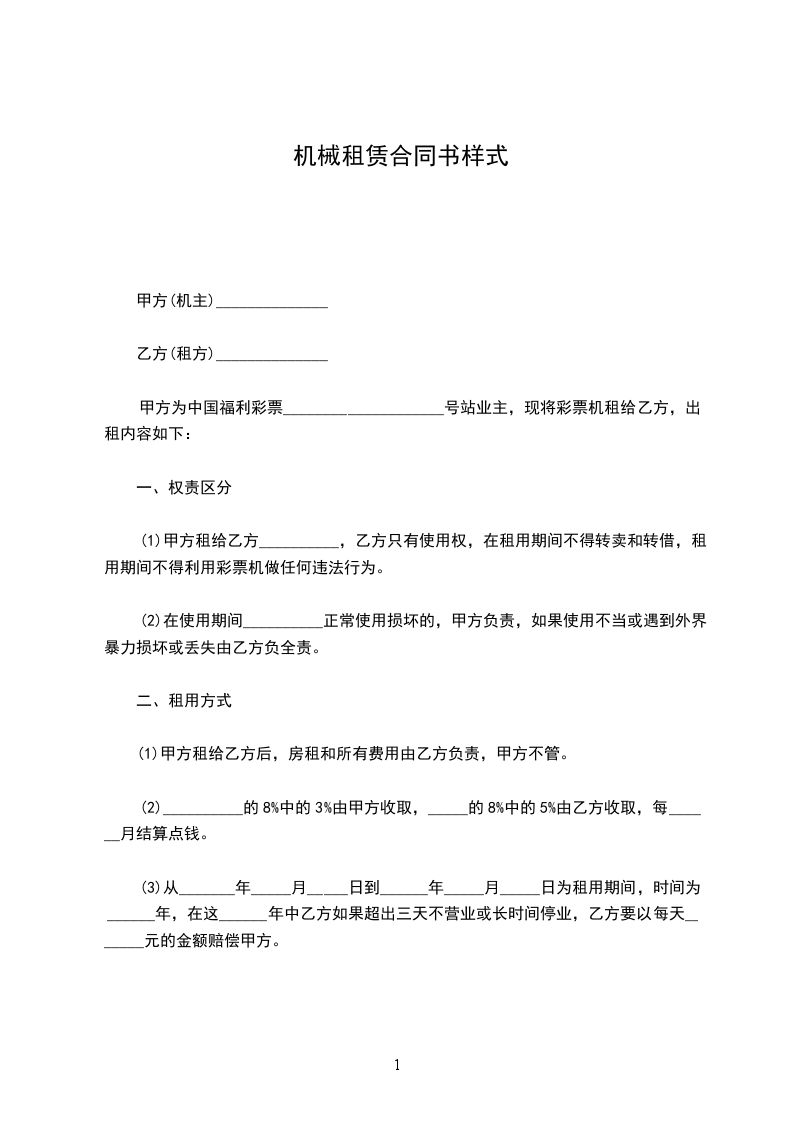 甲方为中国福利彩票____________________号站业主,现将彩票机租给乙方,出租内容如下: