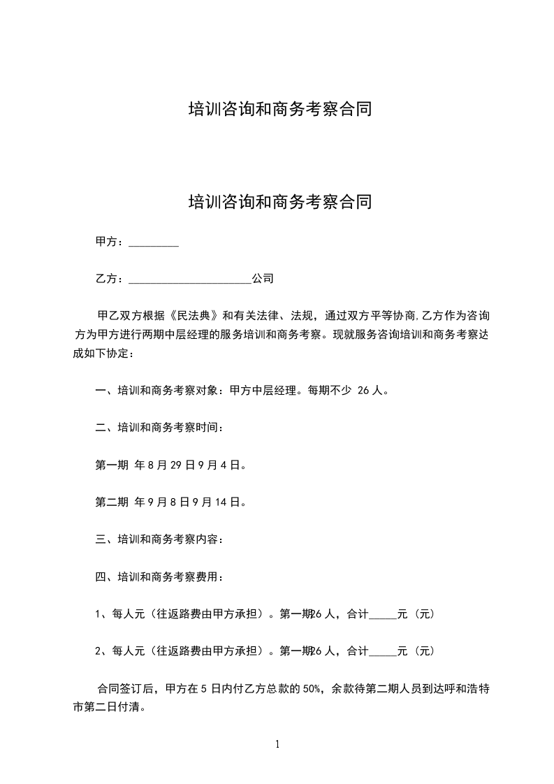 甲乙双方根据《民法典》和有关法律、法规,通过双方平等协商,乙方作为咨询方为甲方进行两期中层经理的服务培训和商务考察。现就服务咨询培训和商务考察达成如下协定: