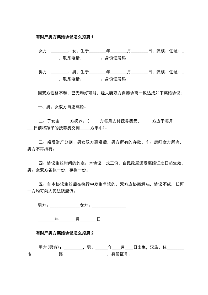 有财产男方离婚协议怎么拟篇2