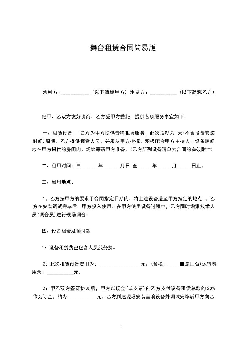 一、租赁设备: 乙方为甲方提供音响租赁服务,此次活动为 天(不含设备安装时间)周期,乙方提供调音人员,并服从甲方指挥,积极配合甲方主持人。设备晚间放在甲方提供的房间内。场地等请甲方准备。(乙方所列设备清单为合同的有效附件)。