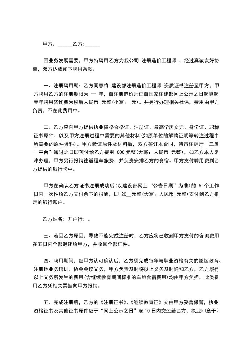 2、合同期间,甲方工程项目由乙方担任建造师的,须另行签订协议并支付相关责任报