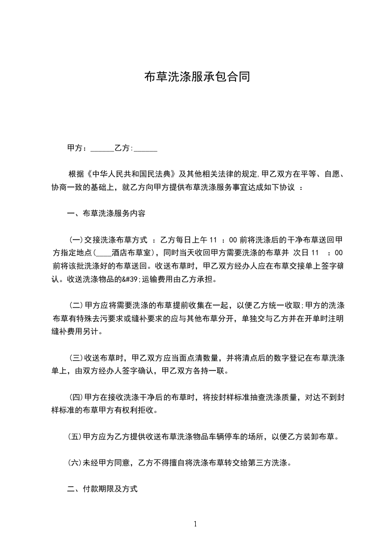 根据《中华人民共和国民法典》及其他有关法律、法规的规定,甲乙双方在平等自愿、协商一致的基础上就干洗洗涤服务达成如下协议: