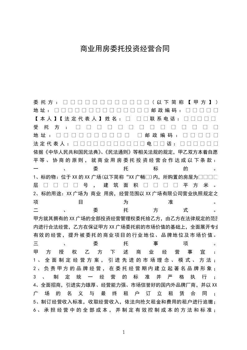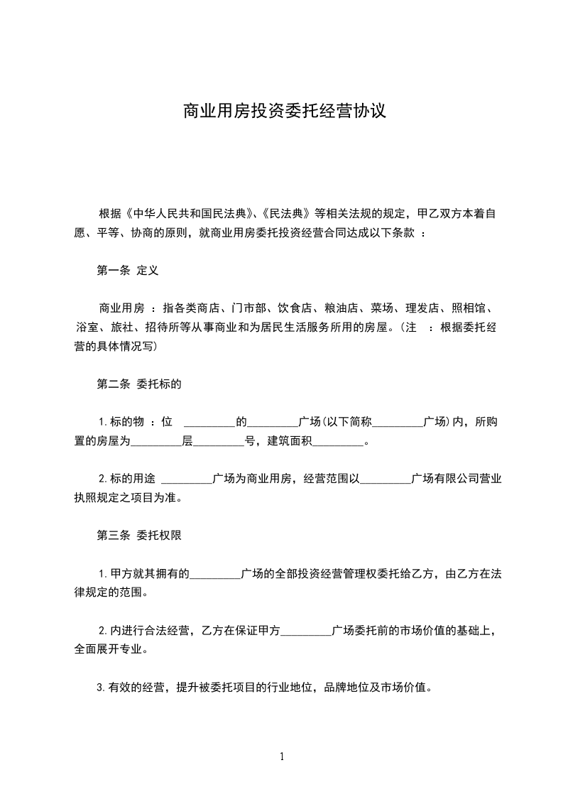 依据《中华人民共和国民法典》、《民法典》等相关法规的规定,甲乙双方本着自愿、平等、协商的原则,就商业用房委托投资经营合作达成以下条款: