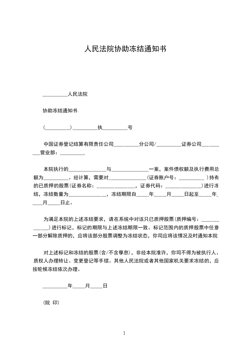 本院执行的_______________与_______________一案,案件债权额及执行费用总额为__________。经计算,需要对_______________(证券账户号:__________ )持有的已质押的股票(证券名称:_______________,证券代码:______________)进行冻结,冻结数量为_______________,冻结期限自_____年_____月_____日起至_____年_____月_____日止。