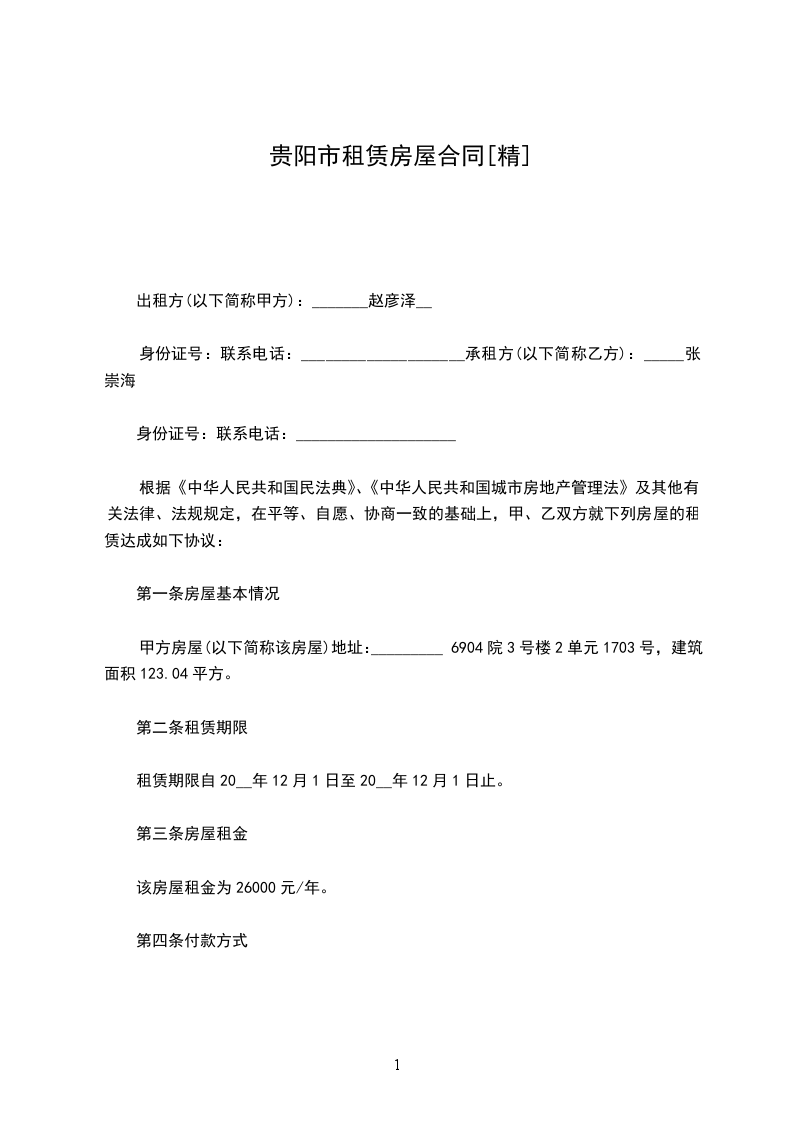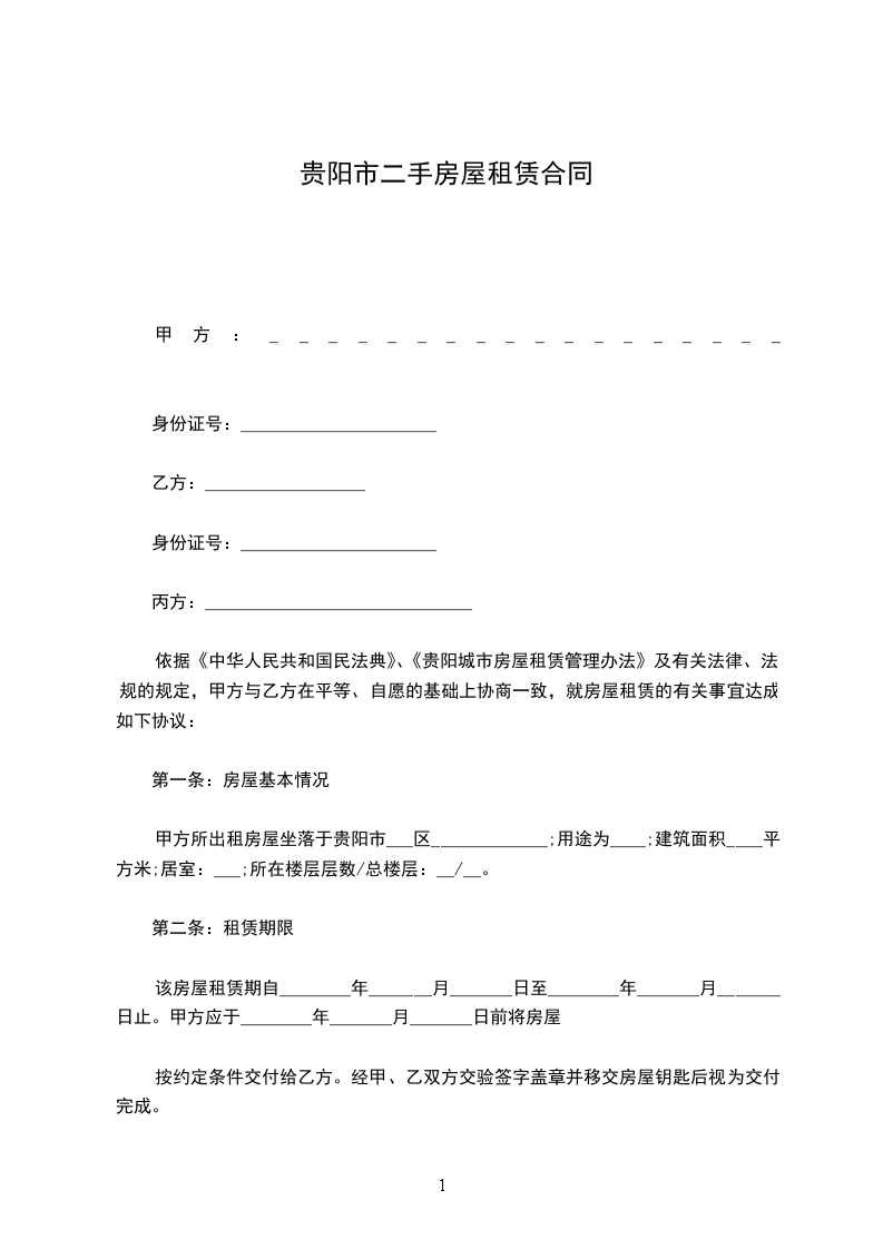 (一)甲方所出租房屋(以下简称该房屋)坐落于贵阳市____________区_______________ 建筑面积__________平方米;居室:_________________;所在楼层层数/总数:_________________。