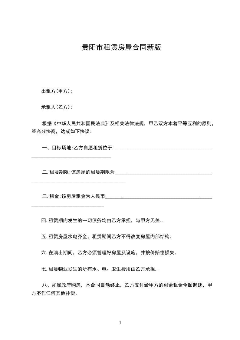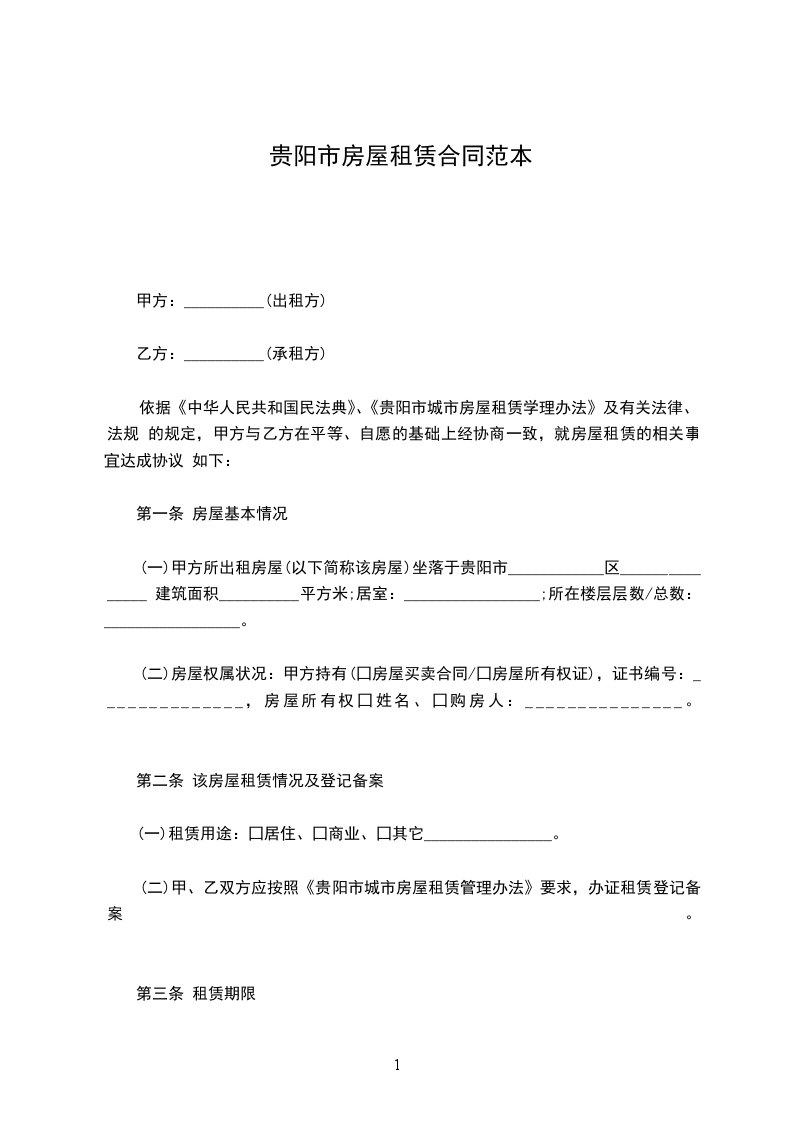 依据《中华人民共和国民法典》、《贵阳市城市房屋租赁学理办法》及有关法律、法规 的规定,甲方与乙方在平等、自愿的基础上经协商一致,就房屋租赁的相关事宜达成协议 如下: