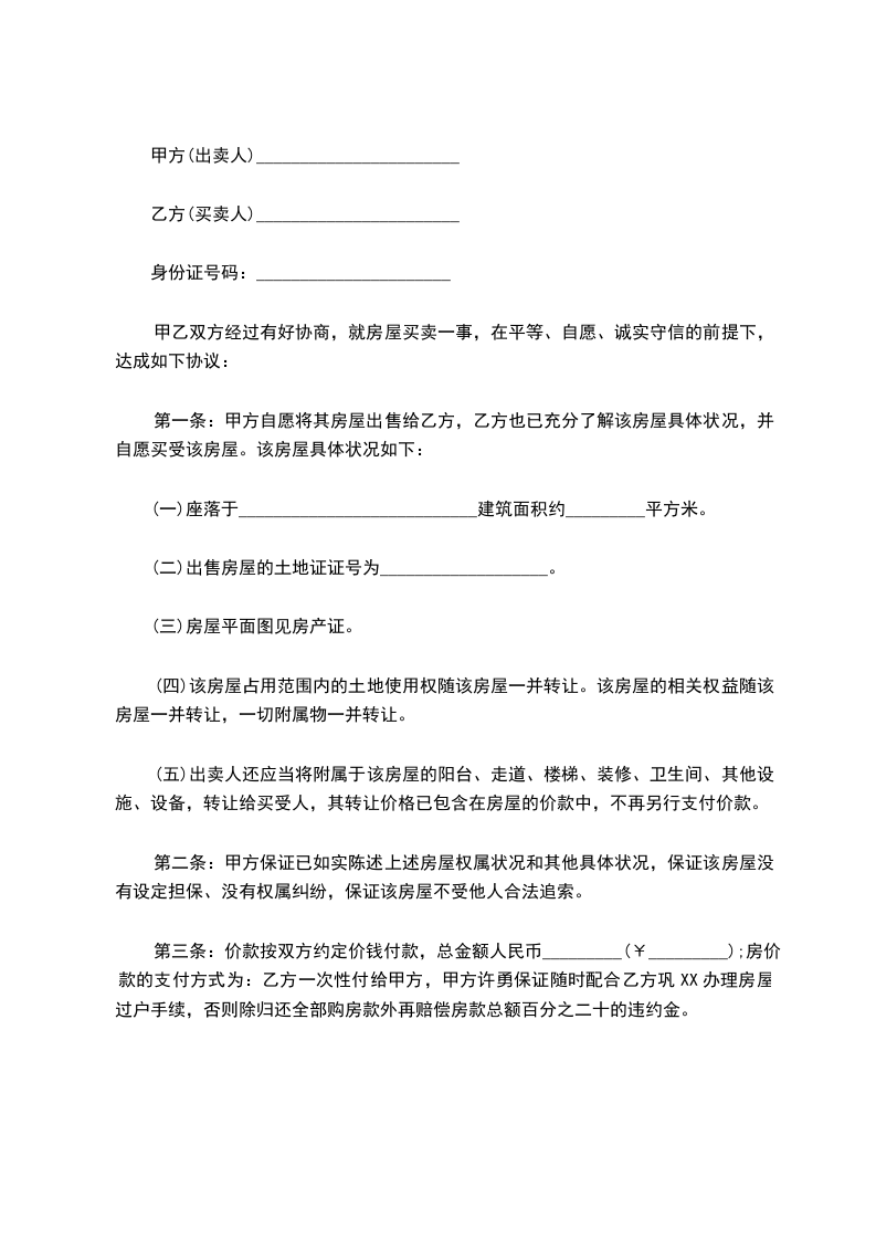 第三条:价款按双方约定价钱付款,总金额人民币_________(¥_________);房价款的支付方式为:乙方一次性付给甲方,甲方许勇保证随时配合乙方巩XX办理房屋过户手续,否则除归还全部购房款外再赔偿房款总额百分之二十的违约金。