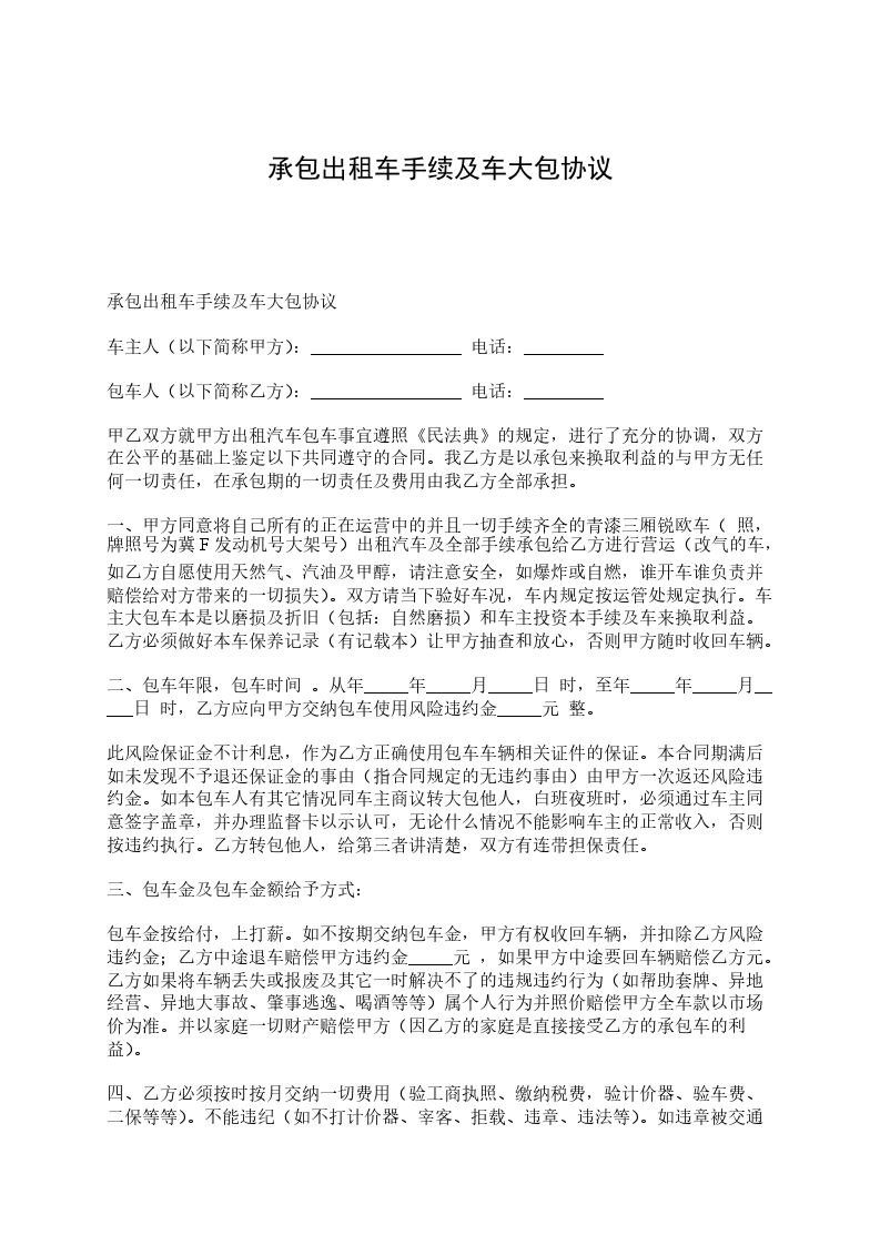 一、甲方同意将自己所有的正在运营中的并且一切手续齐全的青漆三厢锐欧车( 照,牌照号为冀F发动机号大架号)出租汽车及全部手续承包给乙方进行营运(改气的车,如乙方自愿使用天然气、汽油及甲醇,请注意安全,如爆炸或自燃,谁开车谁负责并赔偿给对方带来的一切损失)。双方请当下验好车况,车内规定按运管处规定执行。车主大包车本是以磨损及折旧(包括:自然磨损)和车主投资本手续及车来换取利益。乙方必须做好本车保养记录(有记载本)让甲方抽查和放心,否则甲方随时收回车辆。