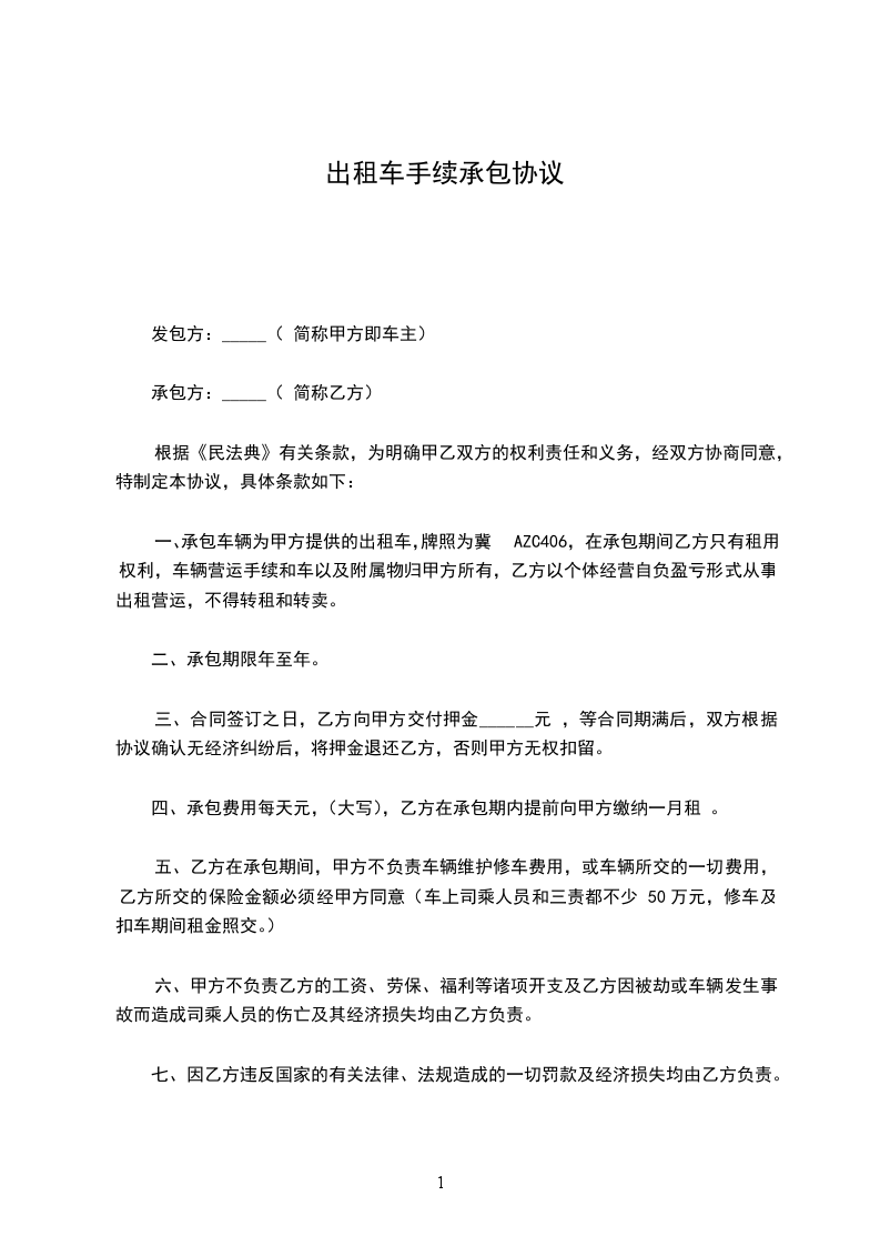 甲乙双方就甲方出租汽车包车事宜遵照《民法典》的规定,进行了充分的协调,双方在公平的基础上鉴定以下共同遵守的合同。我乙方是以承包来换取利益的与甲方无任何一切责任,在承包期的一切责任及费用由我乙方全部承担。