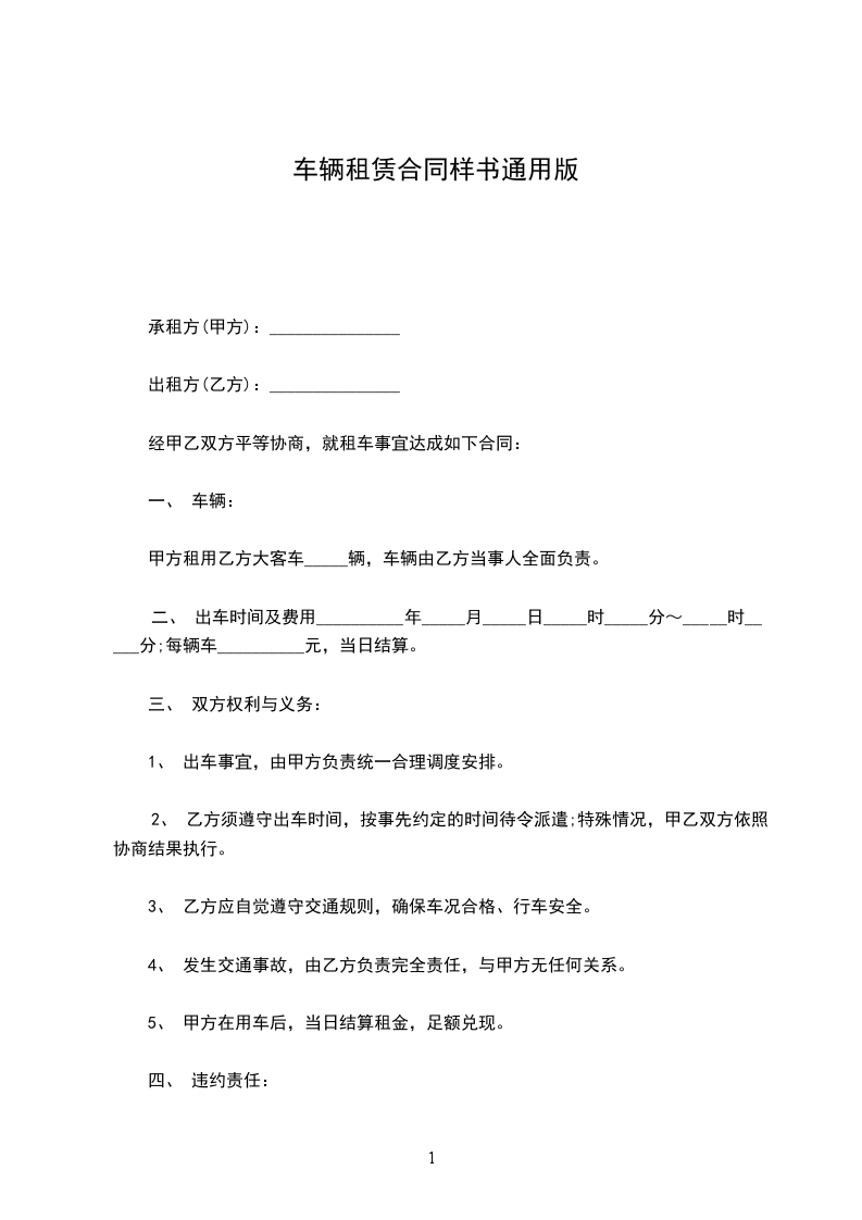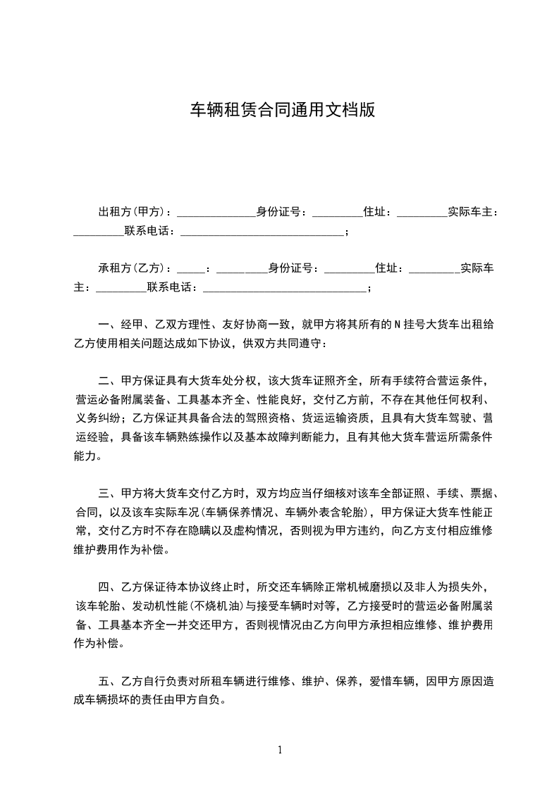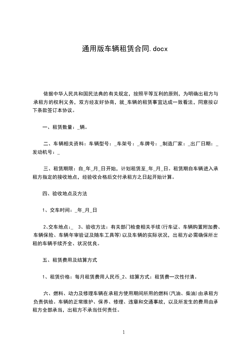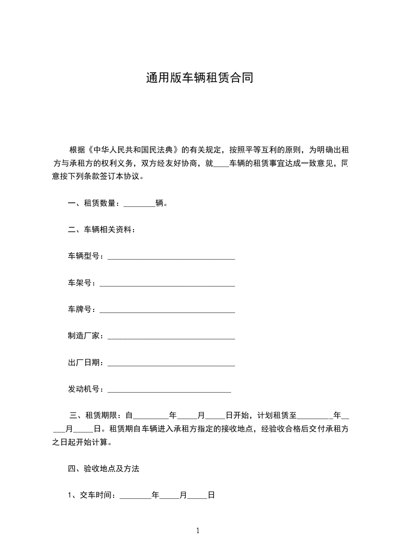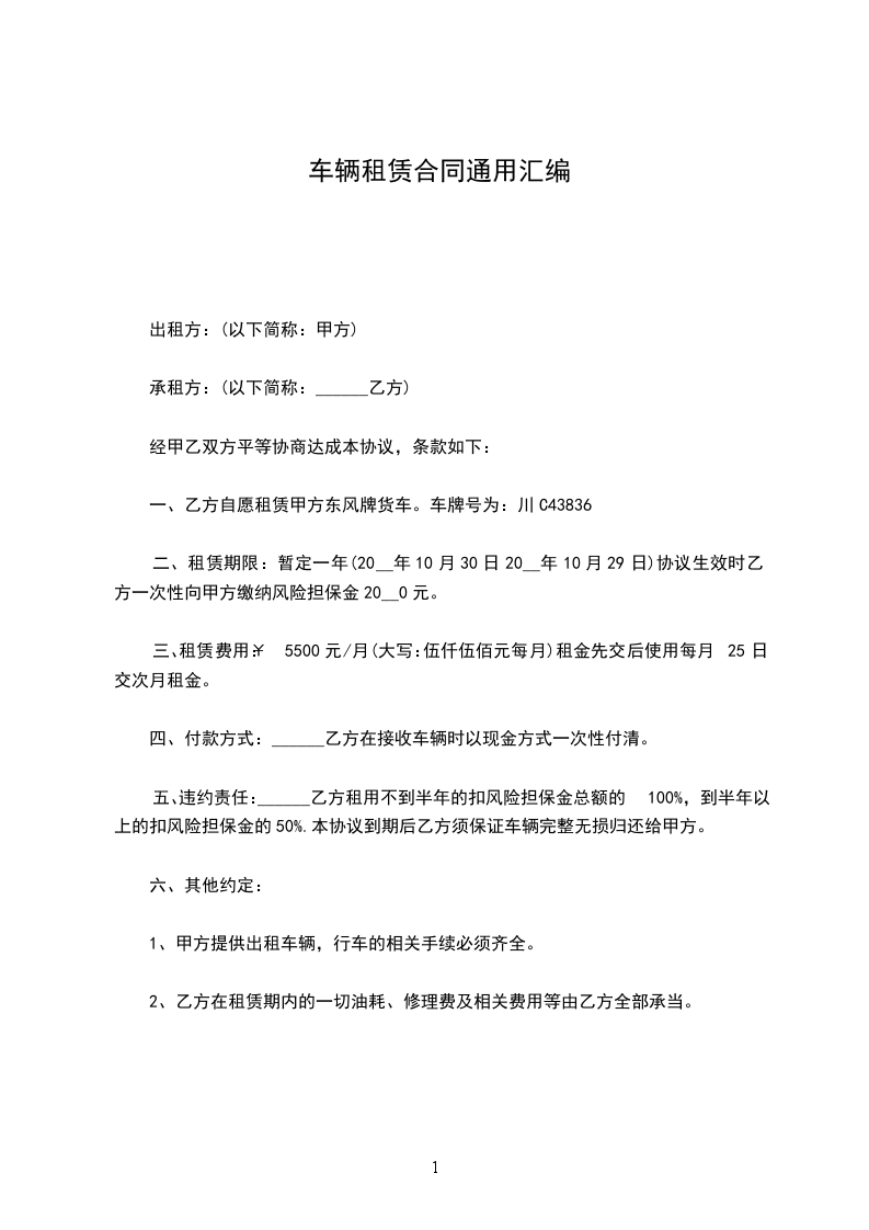 一、车辆出租:甲方自愿将其拥有的________牌汽车(牌照号码:_____________)出租给乙方做使用。甲方应当于本协议订立之日起_____日内向乙方交付车辆,同时还应交付行驶证、较强险、车船使用税、随车工具。