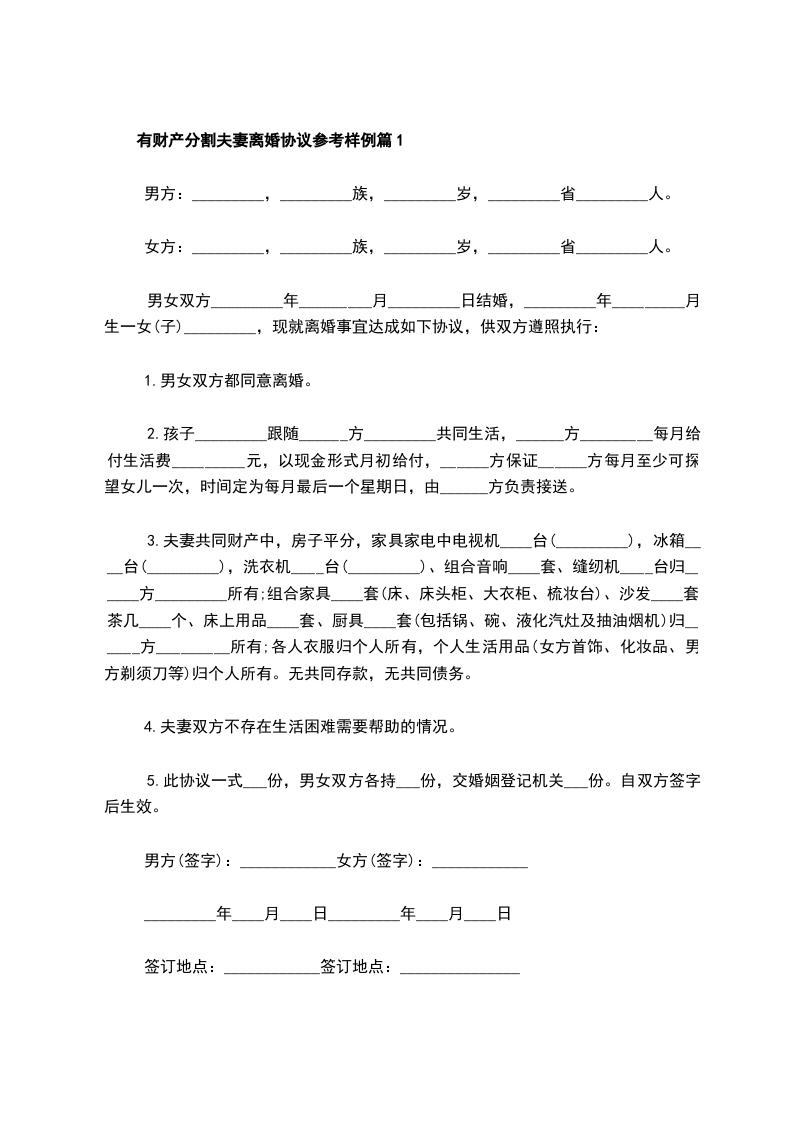 有财产分割夫妻离婚协议参考样例篇5