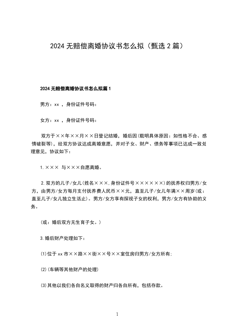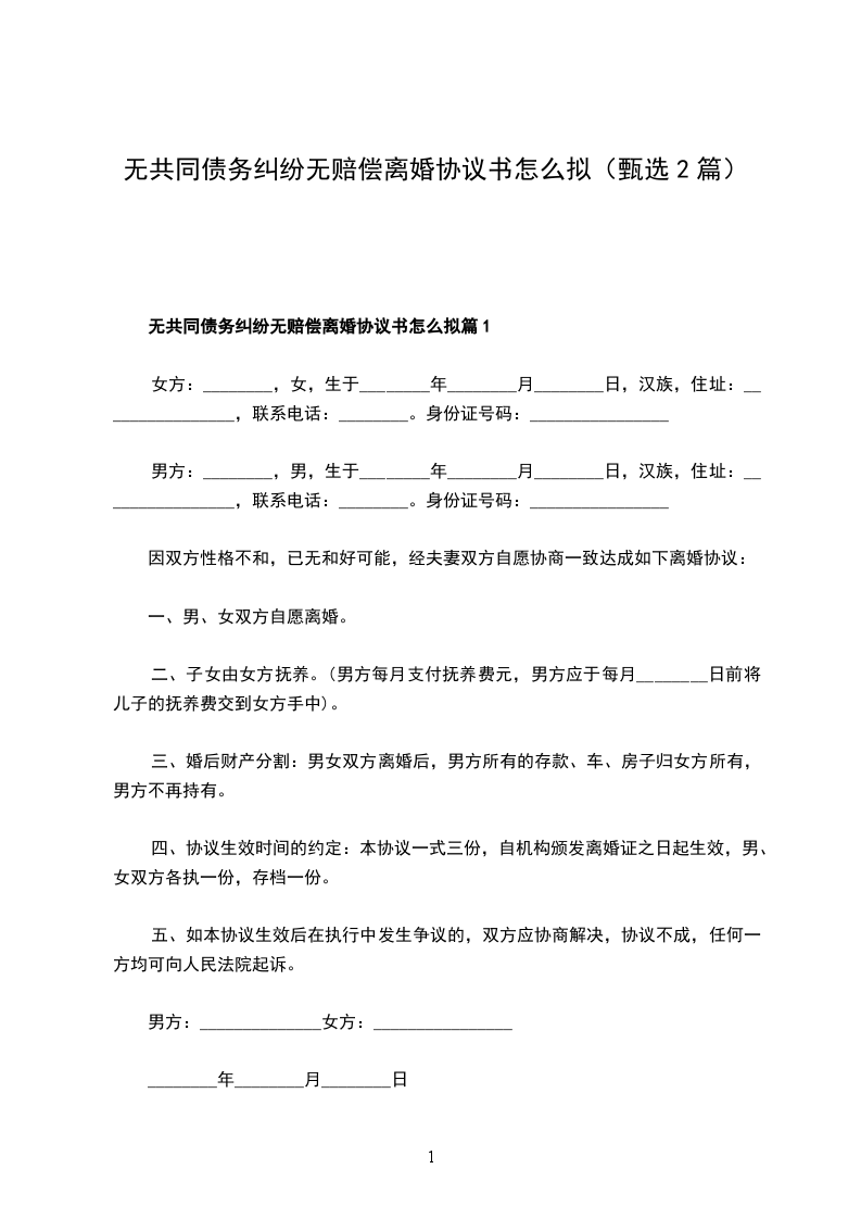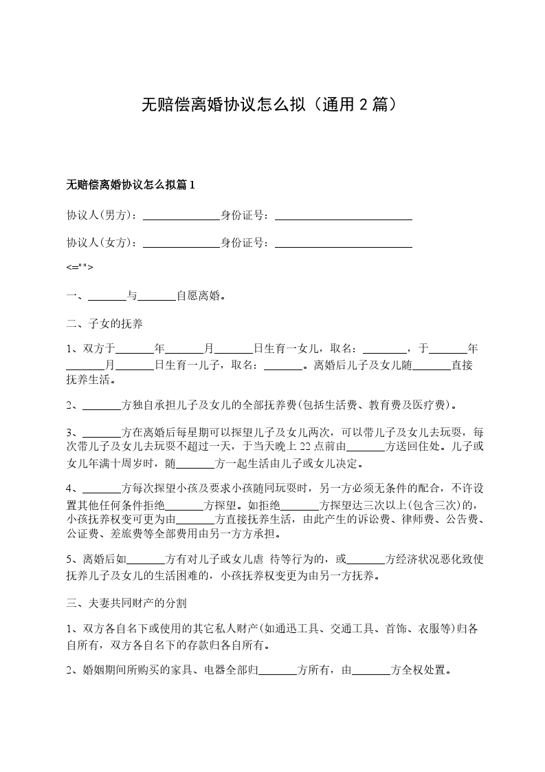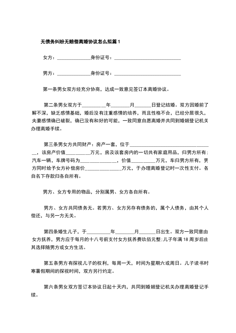 全新无赔偿协议离婚范本怎么拟篇1