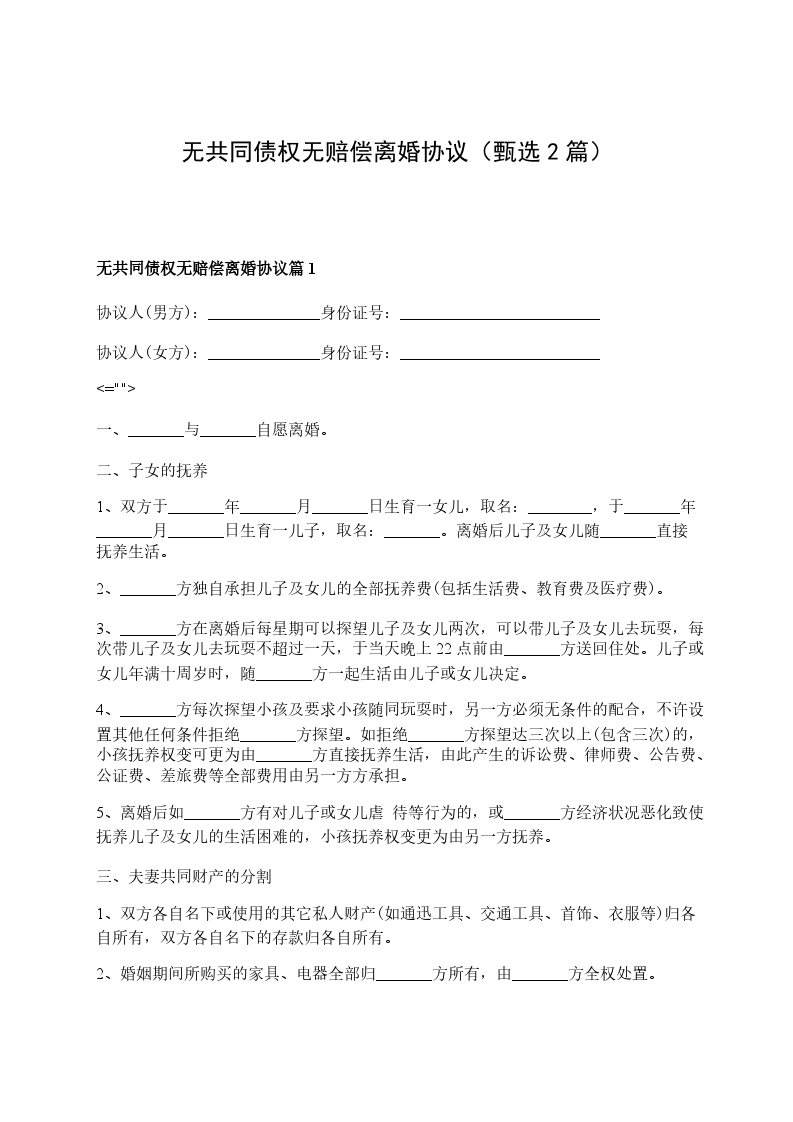 全新无赔偿协议离婚范本怎么拟篇2