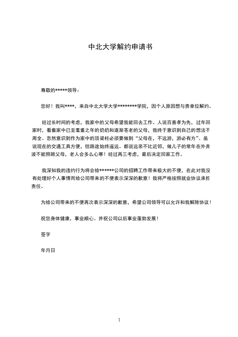 您好!我叫****,来自中北大学大学********学院,因个人原因想与贵单位解约。