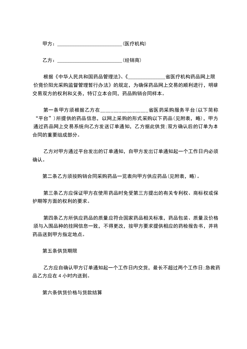根据《中华人民共和国民法典》,甲、乙双方经协商确定,甲方向乙方购买药品。为明确双方责任和权利,特签订本合同,共同遵守。具体条款如下: