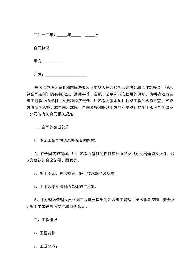 按照《中华人民共和国民法典》、《中华人民共和国劳动法》和《建筑安装工程承包合同条例》的有关规定,遵循平等、自愿、公平和诚实信用的原则。为明确双方在施工过程中的权利、义务和经济责任、甲乙双方就本项目桥梁工程的合作事宜,经双方协商同意签订本合同。本施工合同遵守和服从甲方与业主签订的施工承包合同以及__公司的有关合同相关规定。